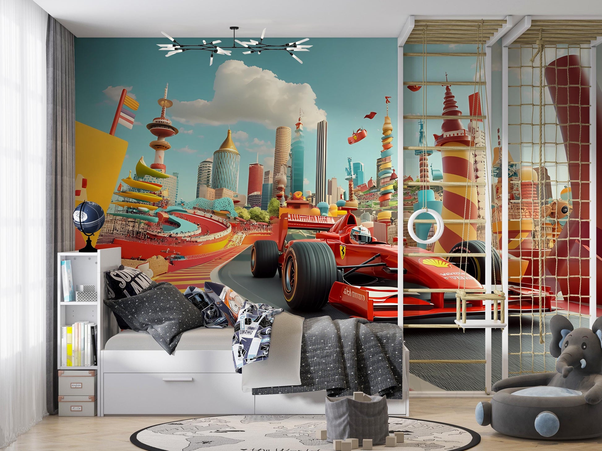 Kids Race Car Wall Mural – Colorful Formula 1 Cityscape Wallpaper for Boys Room