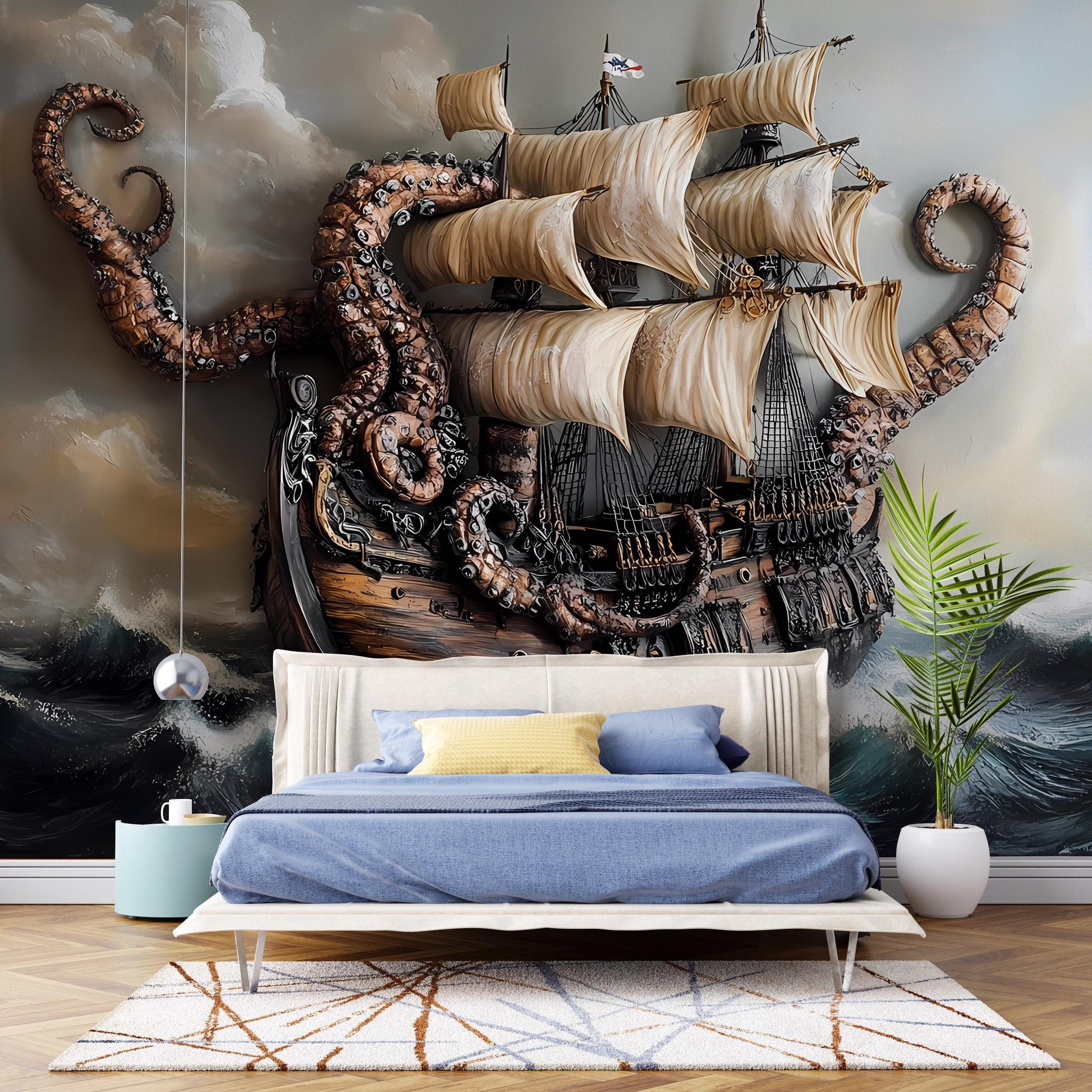 Kraken Ship Wall Mural | Nautical Pirate Bedroom Decor | Giant Octopus Sea Battle Art Print
