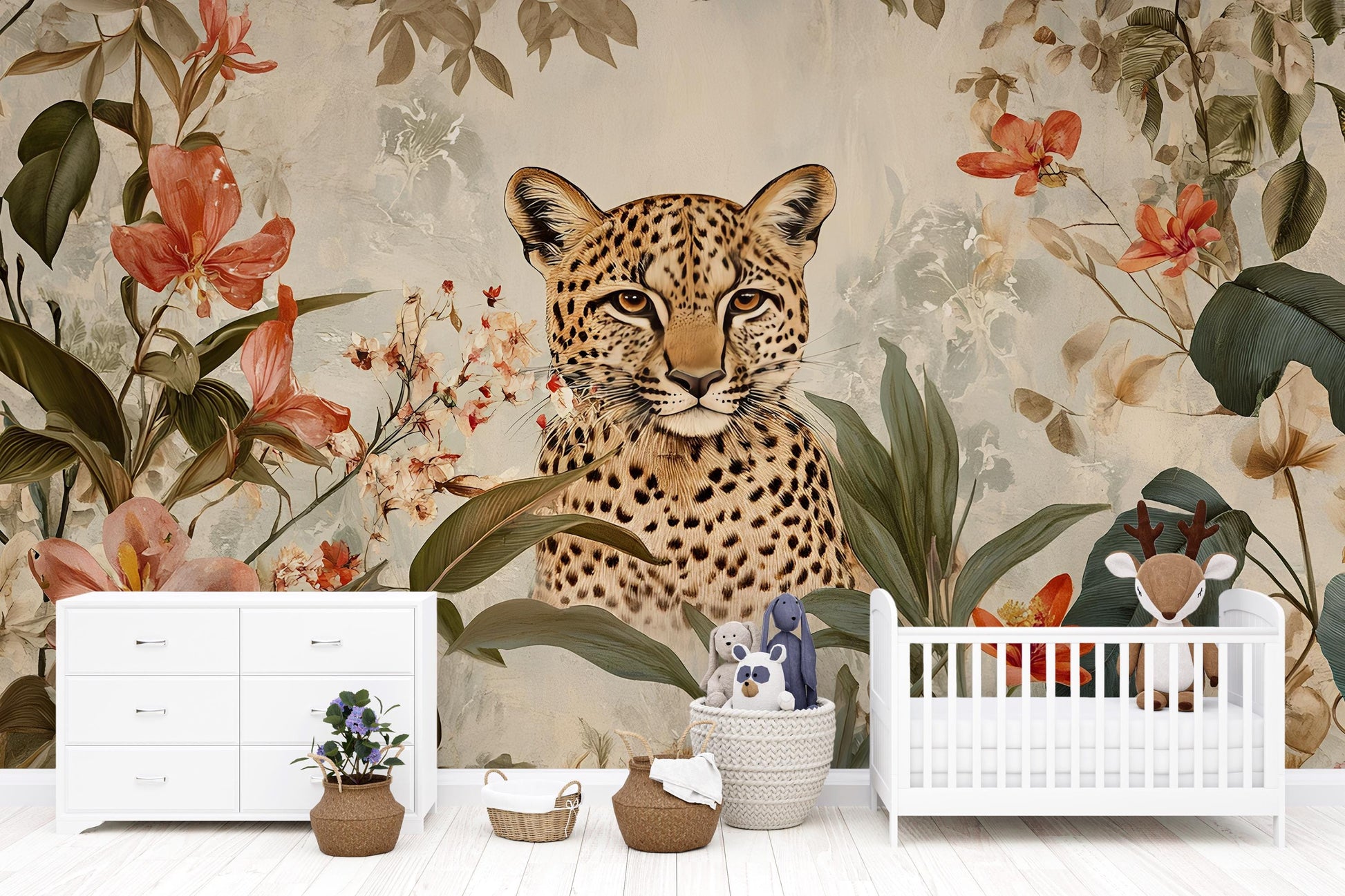 Transform your nursery into a whimsical safari adventure with our Leopard Jungle Mural Wallpaper. This stunning botanical wall art features a majestic leopard surrounded by lush tropical flowers and leaves, creating a calming yet adventurous space for your baby. Ideal for baby rooms, toddler nurseries, or wild animal-themed kids’ spaces. Printed on high-quality removable peel-and-stick material for easy application and removal.