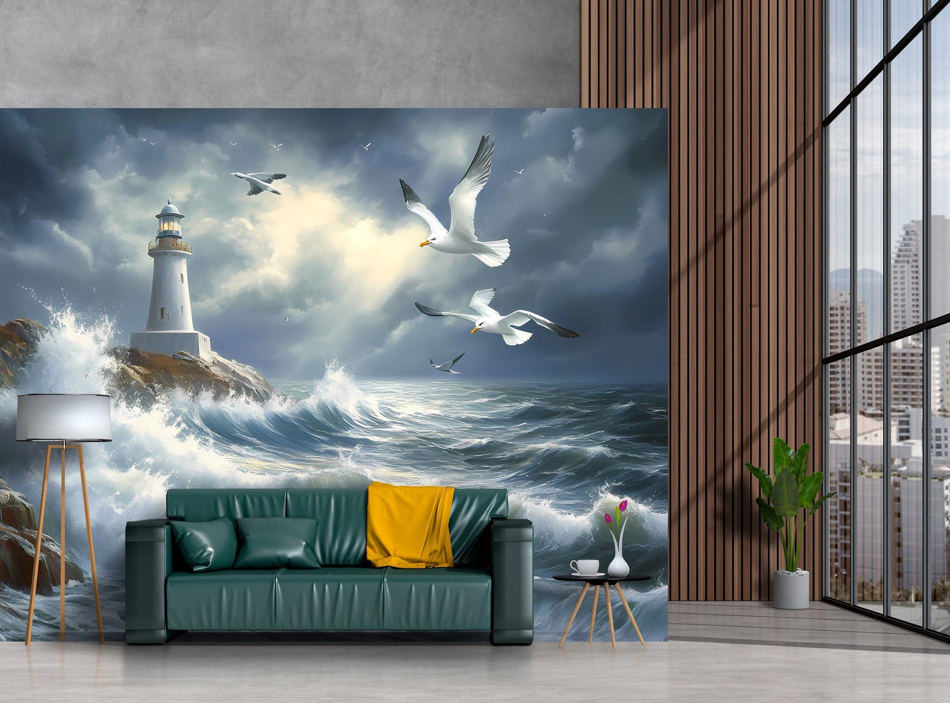 Lighthouse Ocean Wave Wall Mural – Stormy Sea Seagull Art Wallpaper, Coastal Nautical Decor