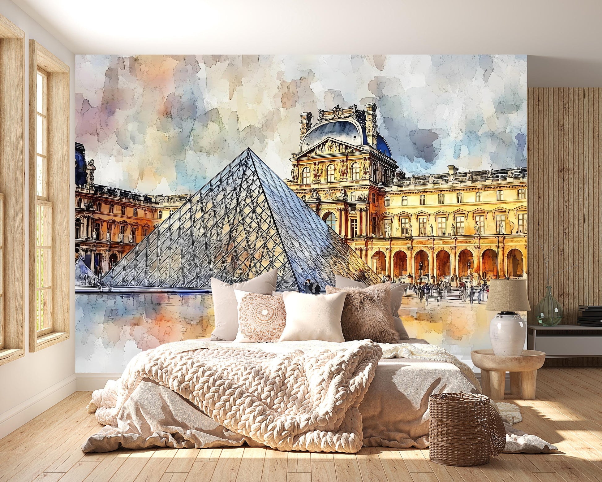 Louvre Pyramid Wall Mural – Paris Watercolor Museum Wallpaper