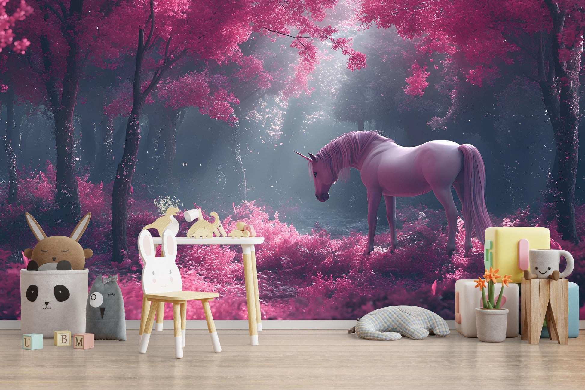 Transform your child's room into a dreamy, magical forest with this Enchanted Unicorn Wall Mural. Featuring a stunning pink and purple unicorn set in a glowing fantasy forest, this mural creates a serene and imaginative backdrop for nurseries, playrooms, or bedrooms.