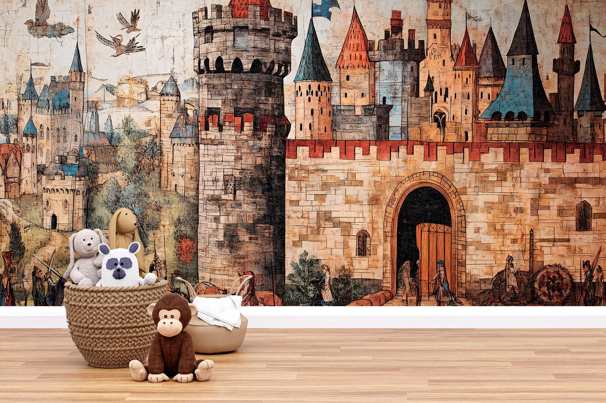 Medieval Castle Wall Mural for Kids Room – Fantasy Fairytale Tapestry Wallpaper – Boys & Girls Nursery Decor – Removable Wall Art Vn186