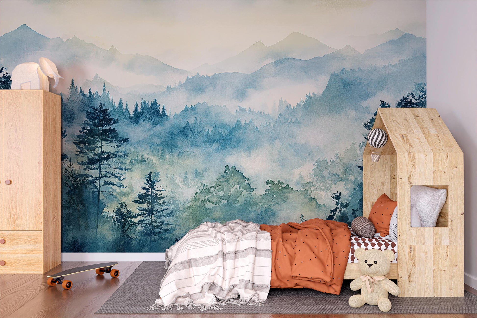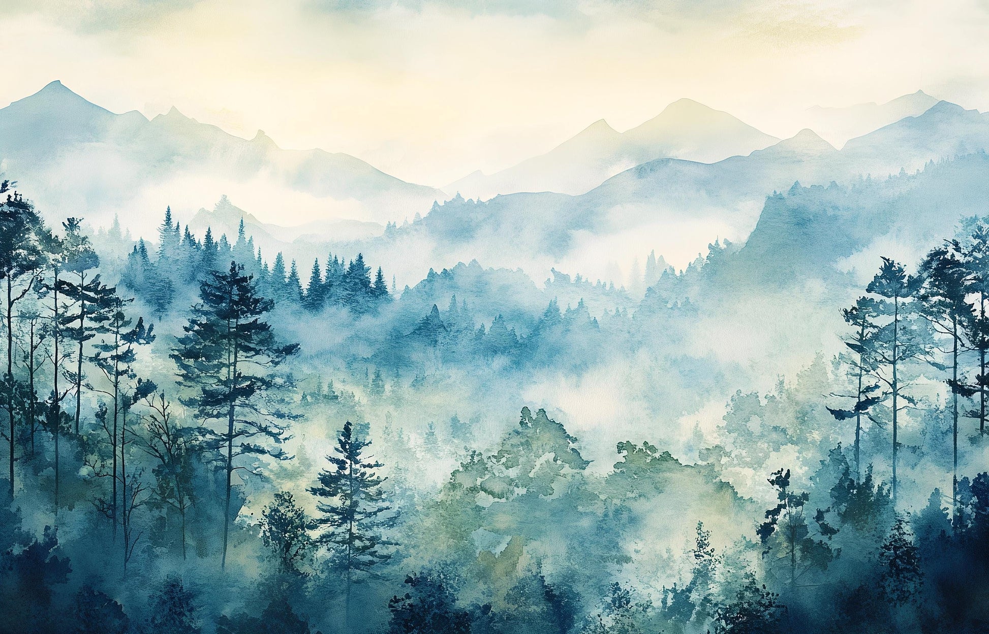 Transform your walls into a peaceful retreat with this misty pine forest mountain wallpaper mural. Featuring watercolor layers of trees and mountains fading into soft mist, this mural brings a serene and calming atmosphere to any room.