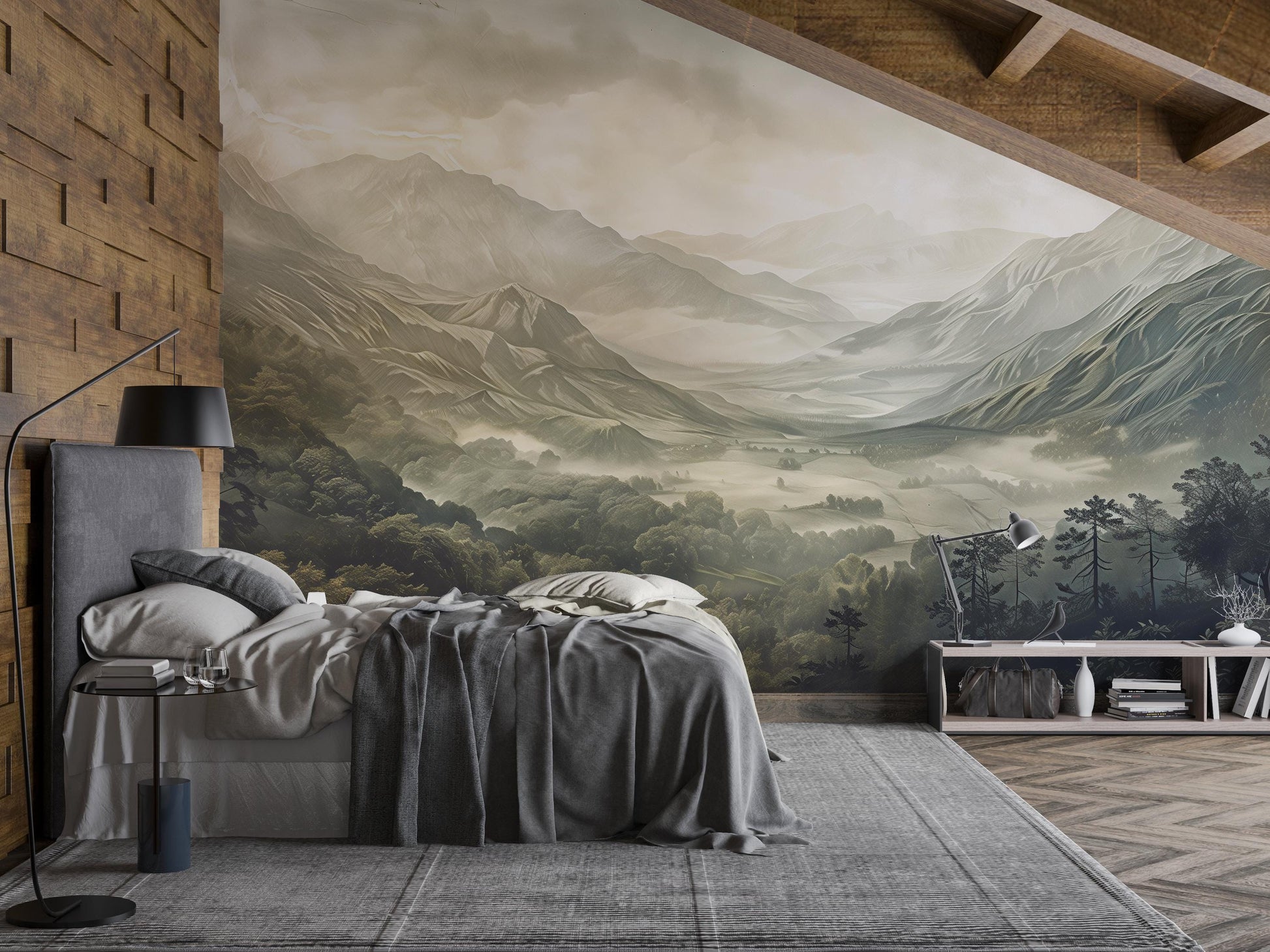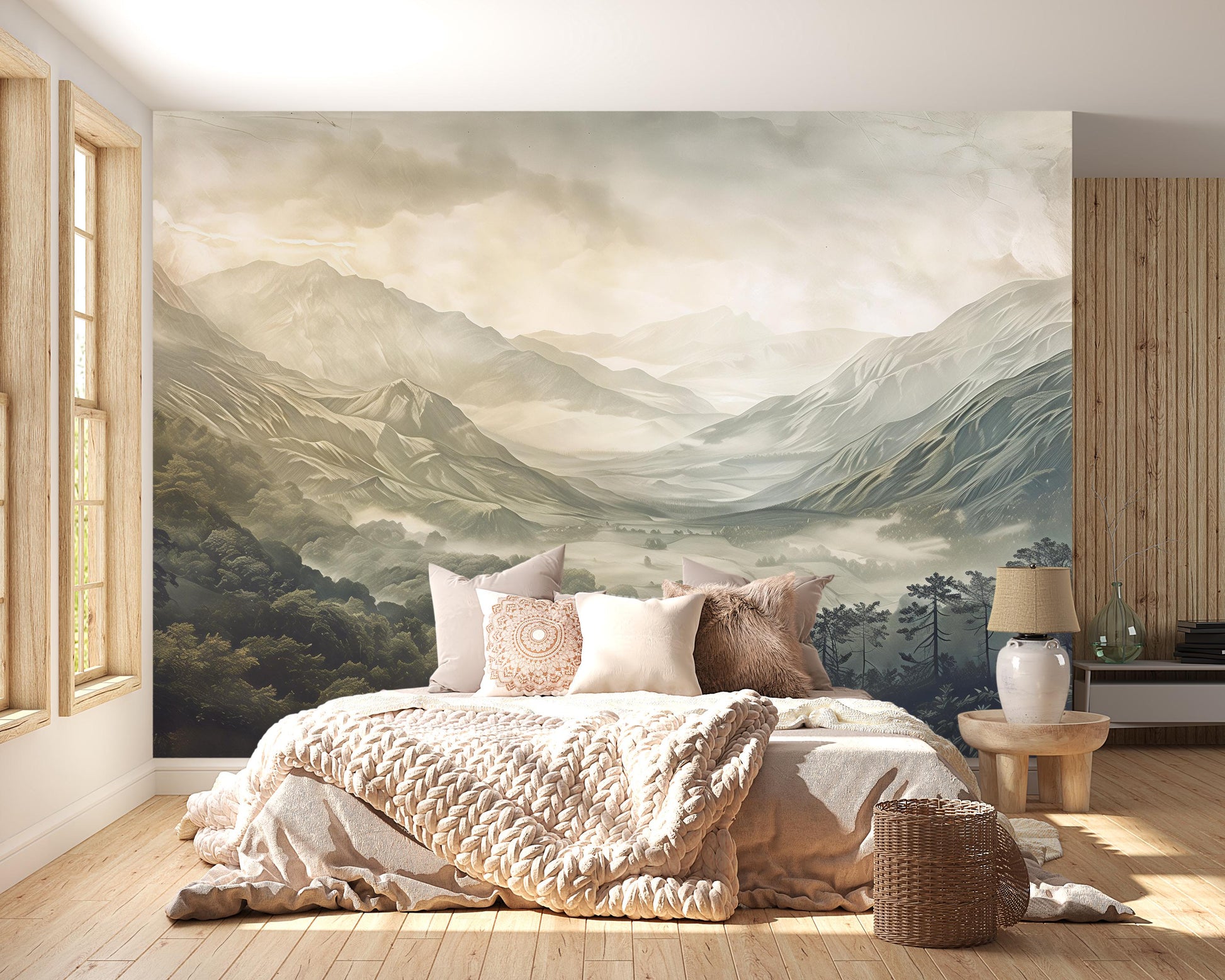Misty Mountain Wall Mural – Scenic Forest Valley Wallpaper for Bedroom