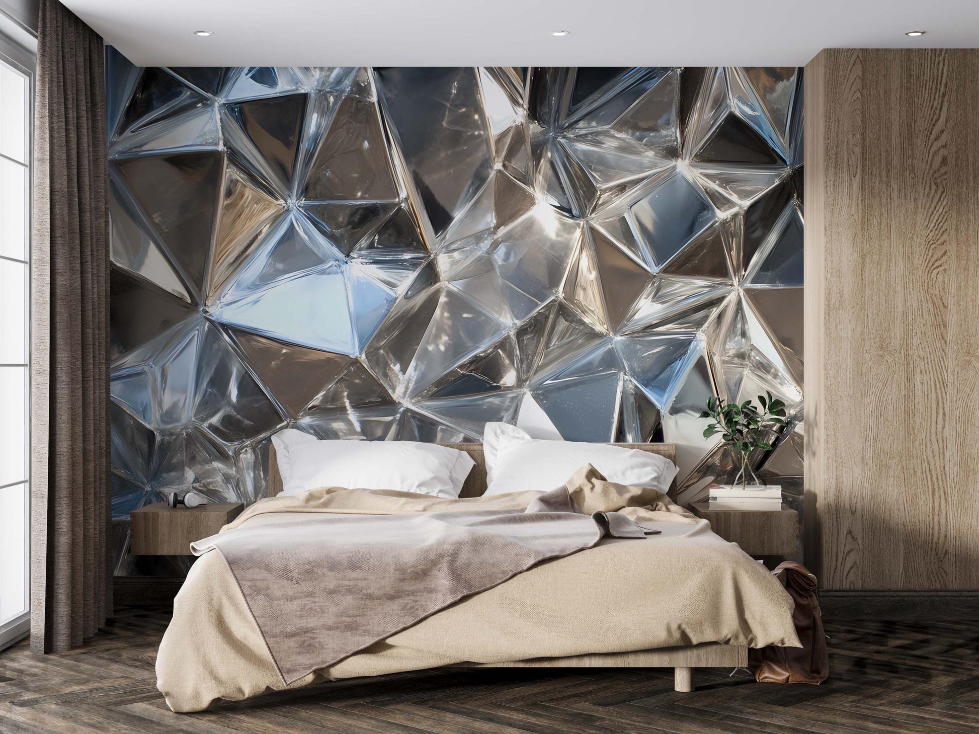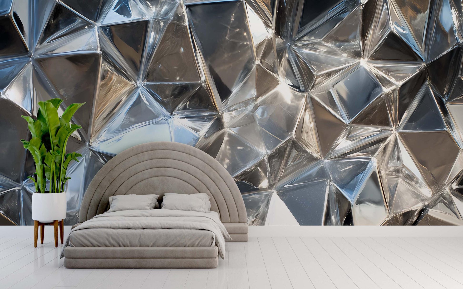 Transform your space with this striking 3D geometric metallic wall mural. Featuring a silver chrome crystal pattern, this luxury abstract wallpaper adds modern elegance and depth to any room. Perfect for bedrooms, living rooms, or creative spaces, the designβs reflective, faceted effect creates a sense of dimension and sophistication. Printed with high-quality materials, it ensures vibrant detail and long-lasting beauty. Elevate your interior design with this bold, contemporary statement piece.