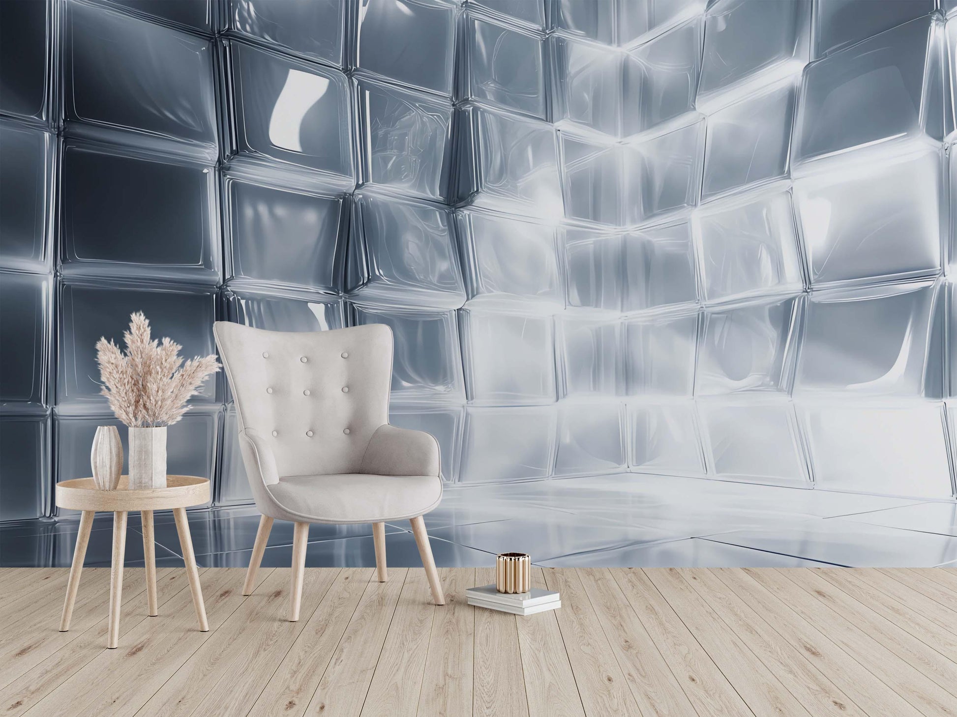 Transform your space with this stunning 3D silver cube wall mural, featuring a futuristic metallic design with light-reflecting effects. Perfect for creating a bold statement wall in your living room, home office, studio, or commercial space, this high-resolution mural brings depth and dimension to any room.