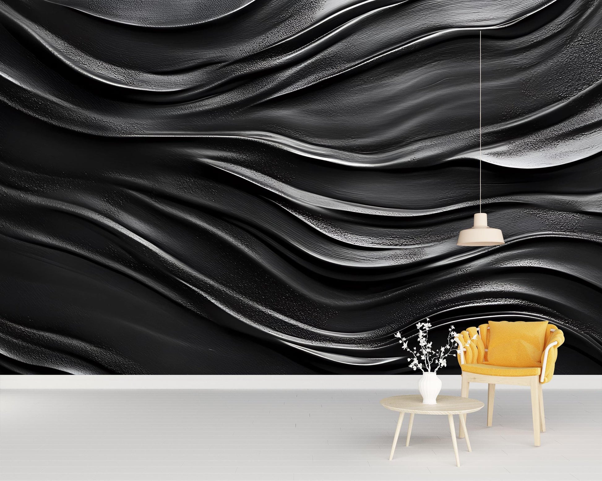 Transform your space with this stunning black wave wall mural. Featuring a bold, 3D textured abstract design, this wallpaper adds drama and sophistication to any room. Perfect for living rooms, bedrooms, home offices, or creative studios, it pairs beautifully with minimalist or modern furniture. Printed in high resolution for a luxurious finish, this mural makes a powerful style statement.