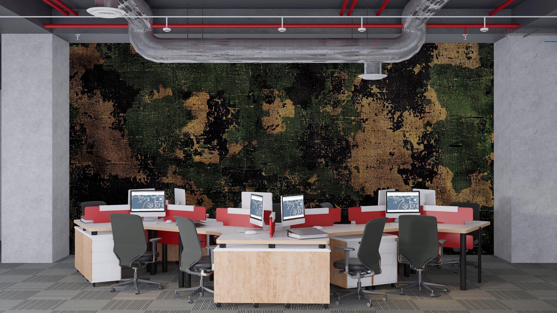 Transform your workout space with this bold, high-impact wall mural featuring a gritty camo design paired with a sleek geometric pattern. Perfect for home gyms, fitness studios, or modern interiors looking for an urban edge. The unique mix of textures and contrasting colors adds both energy and depth to your space.