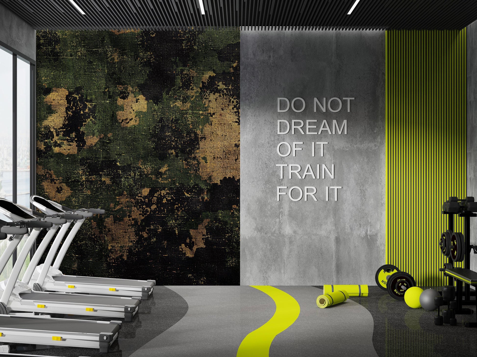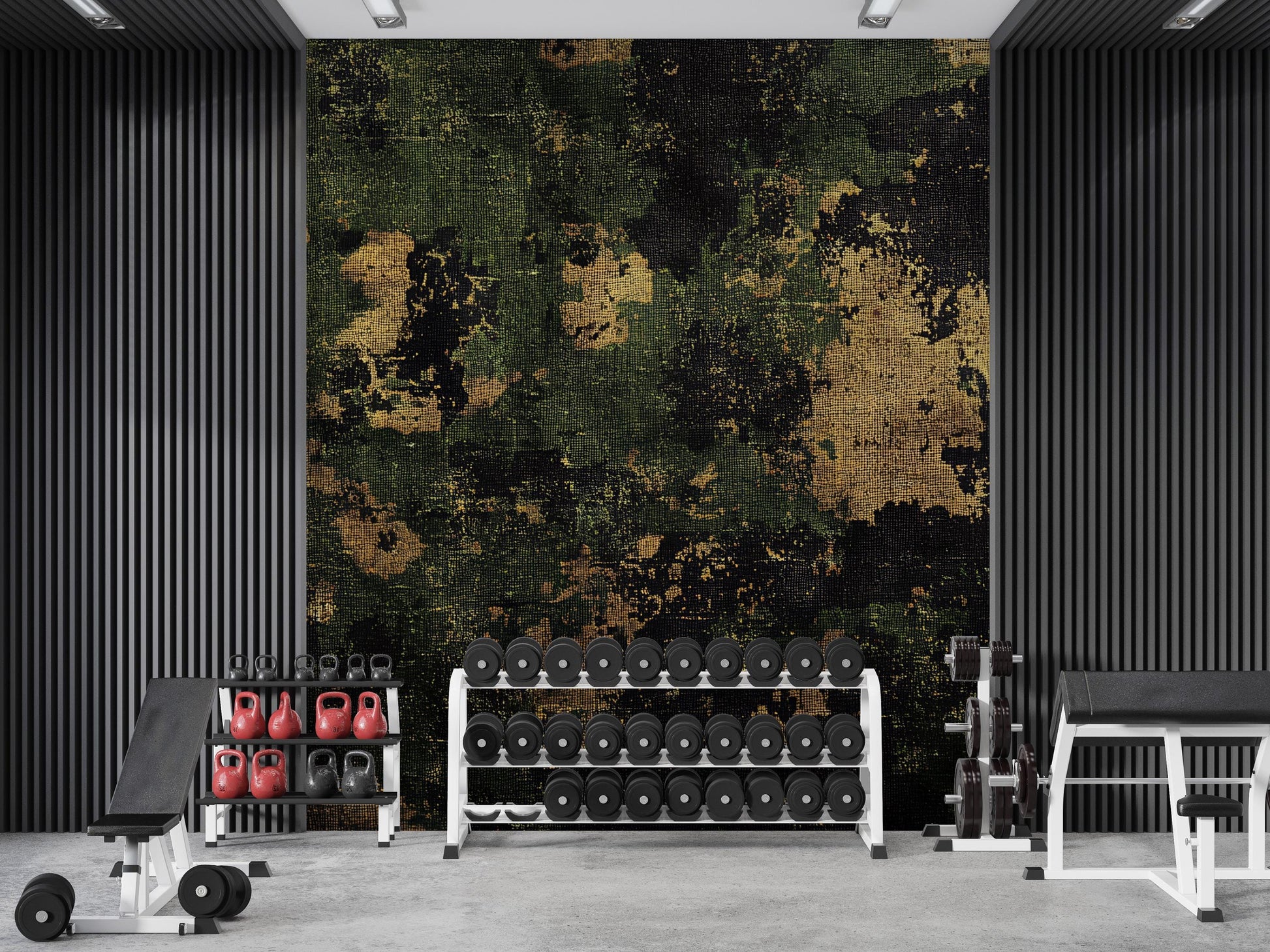 Modern Gym Wall Mural – Industrial Camo & Geometric Pattern, Fitness Center Decor