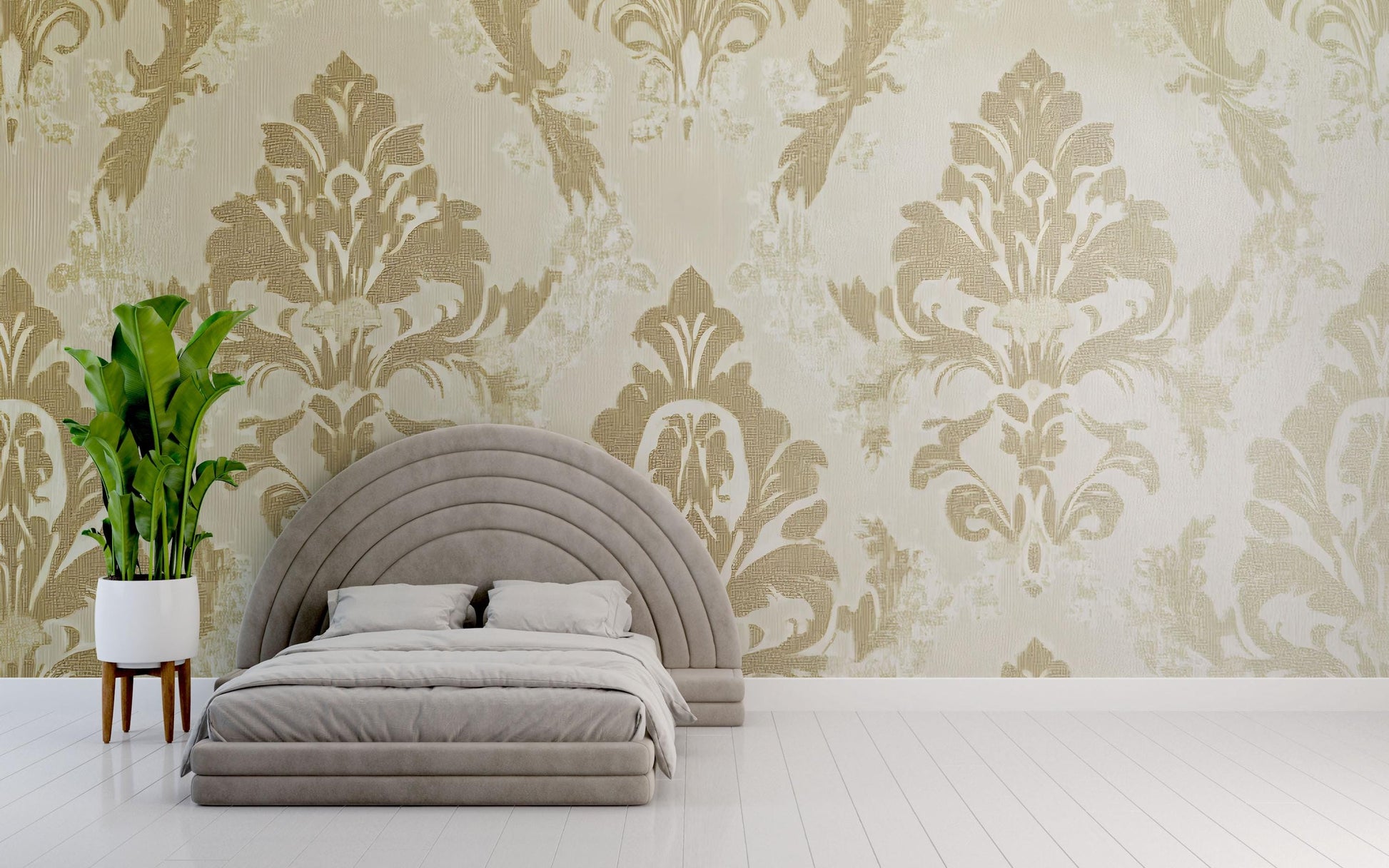 Transform your bedroom with this stunning modern minimalist floor bed featuring a unique semi-circle upholstered headboard in a soft neutral grey. The low profile design creates a cozy, grounded atmosphere—perfect for a calming sleep space. Ideal for contemporary, boho, or Japandi-inspired interiors. Paired with rich damask wallpaper and indoor plants, this bed adds style and serenity to your home. Fits perfectly in small spaces or studio apartments. Great as a statement piece or guest bed option.