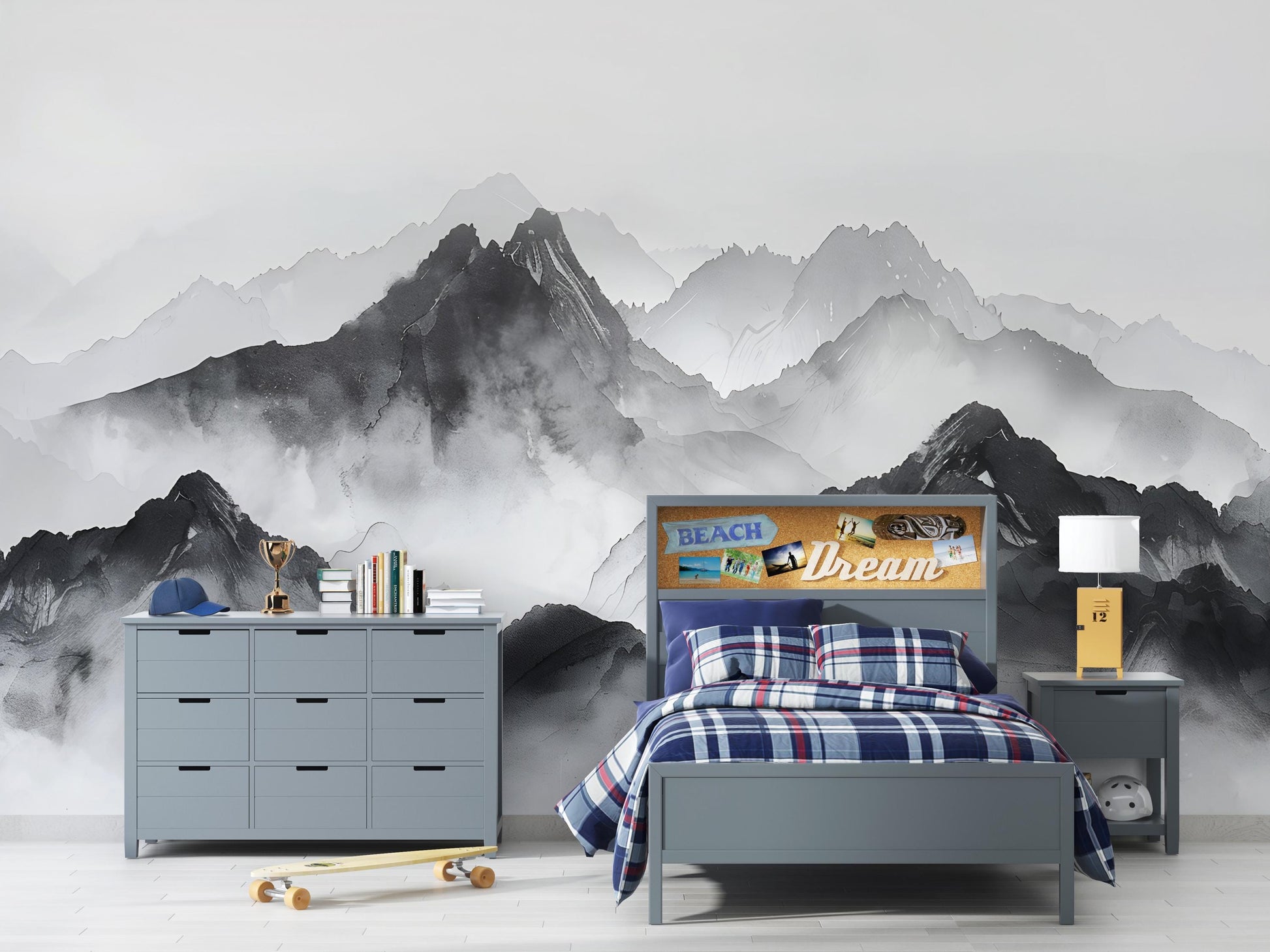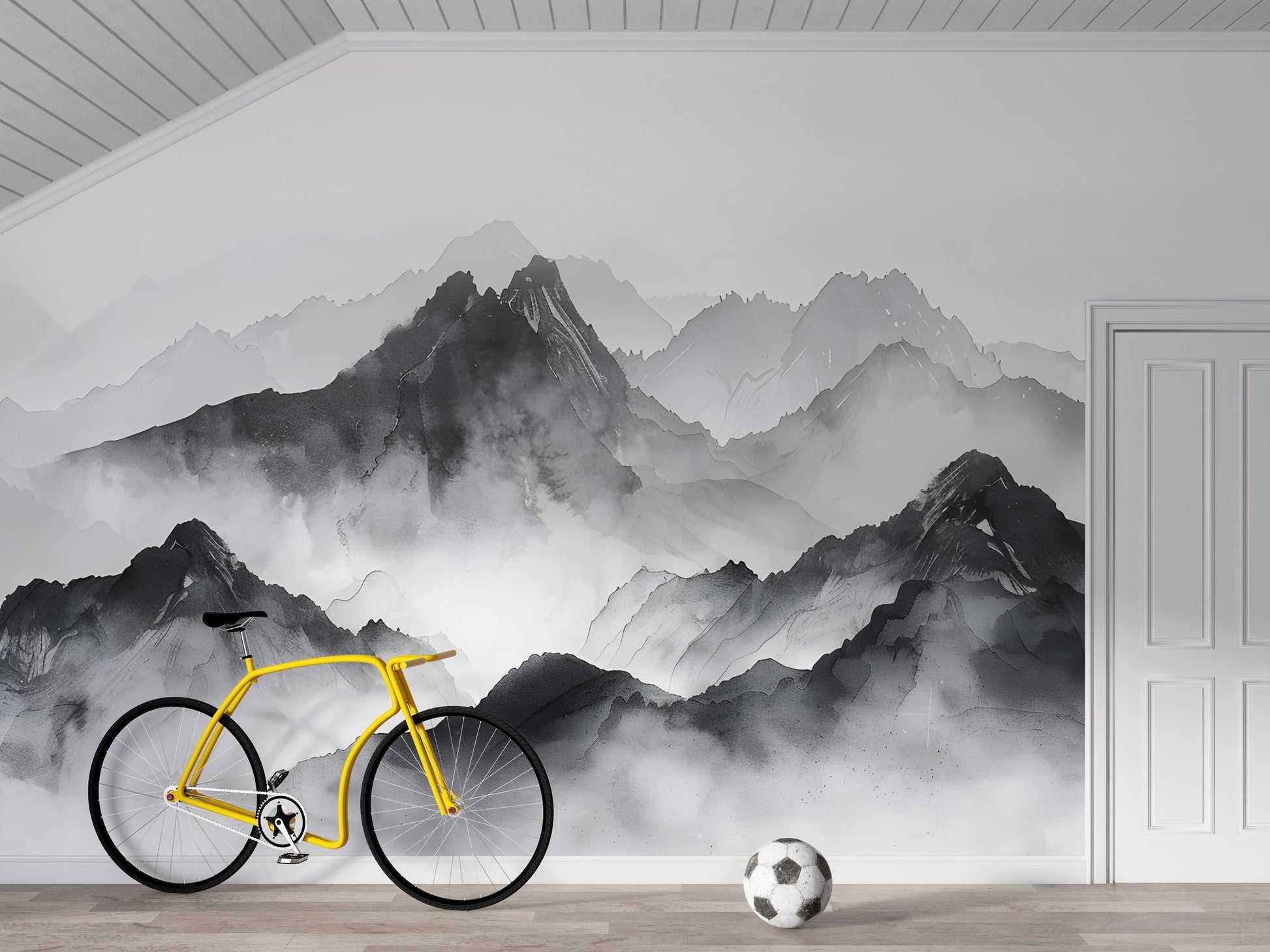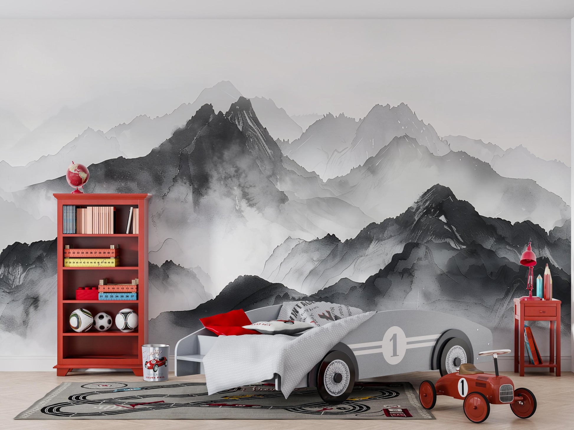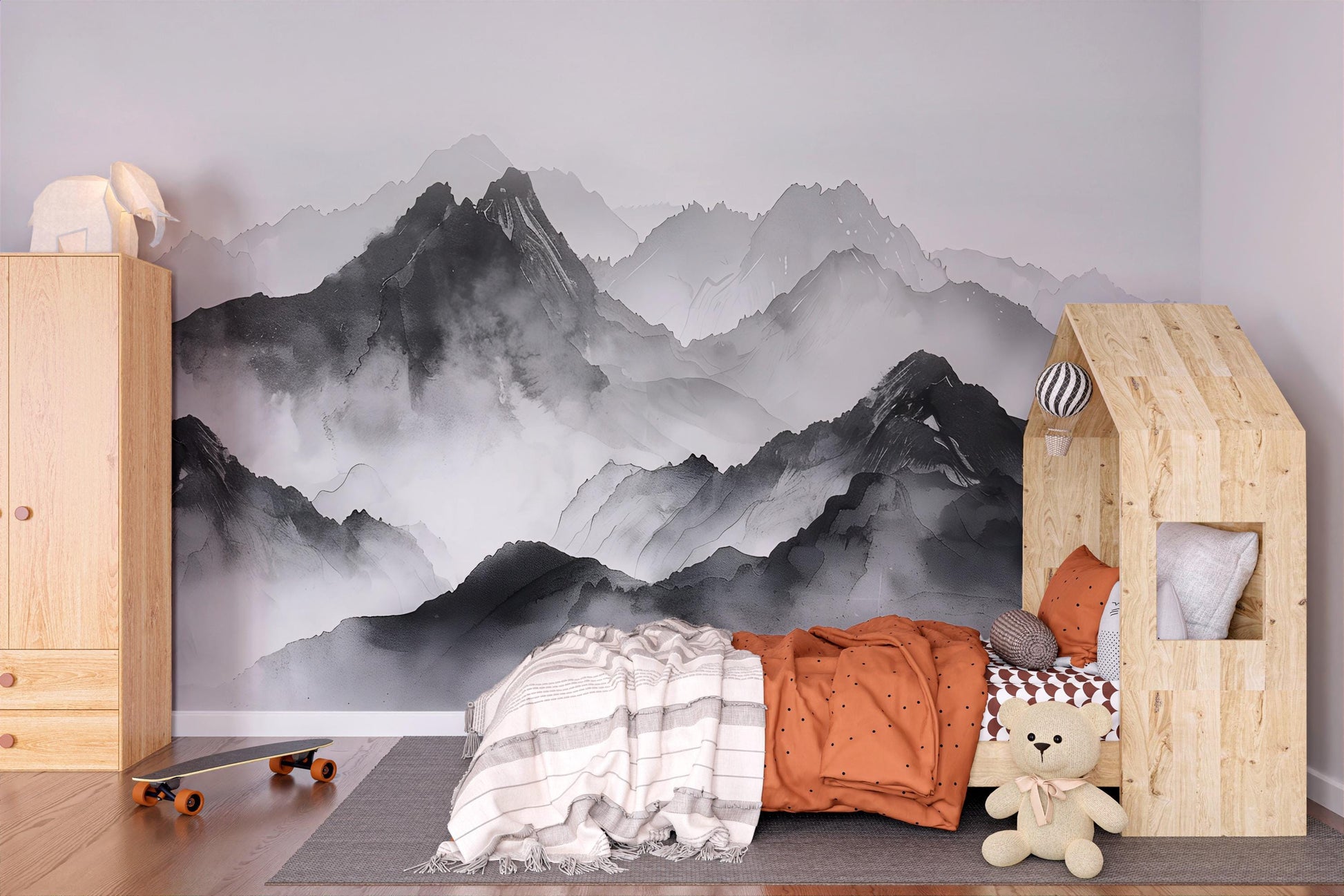 Create a calming and dramatic focal point with this Mountain Wall Mural. Featuring a black-and-white misty mountain landscape, this wallpaper adds depth, texture, and serenity to any space. Perfect for bedrooms, kids’ rooms, living rooms, or offices, it instantly transforms plain walls into a stunning nature-inspired feature.