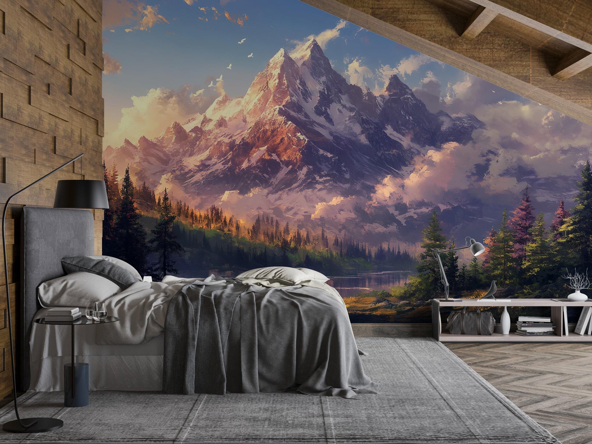 Transform your bedroom into a tranquil mountain retreat with this stunning wall mural. Featuring a dramatic alpine scene with towering snow-covered peaks, vibrant forests, and a peaceful lake, this mural brings the serenity of nature indoors. Perfect for rustic cabin interiors, modern retreats, or nature lovers seeking a bold statement piece. Printed on high-quality wallpaper for easy installation and lasting beauty.