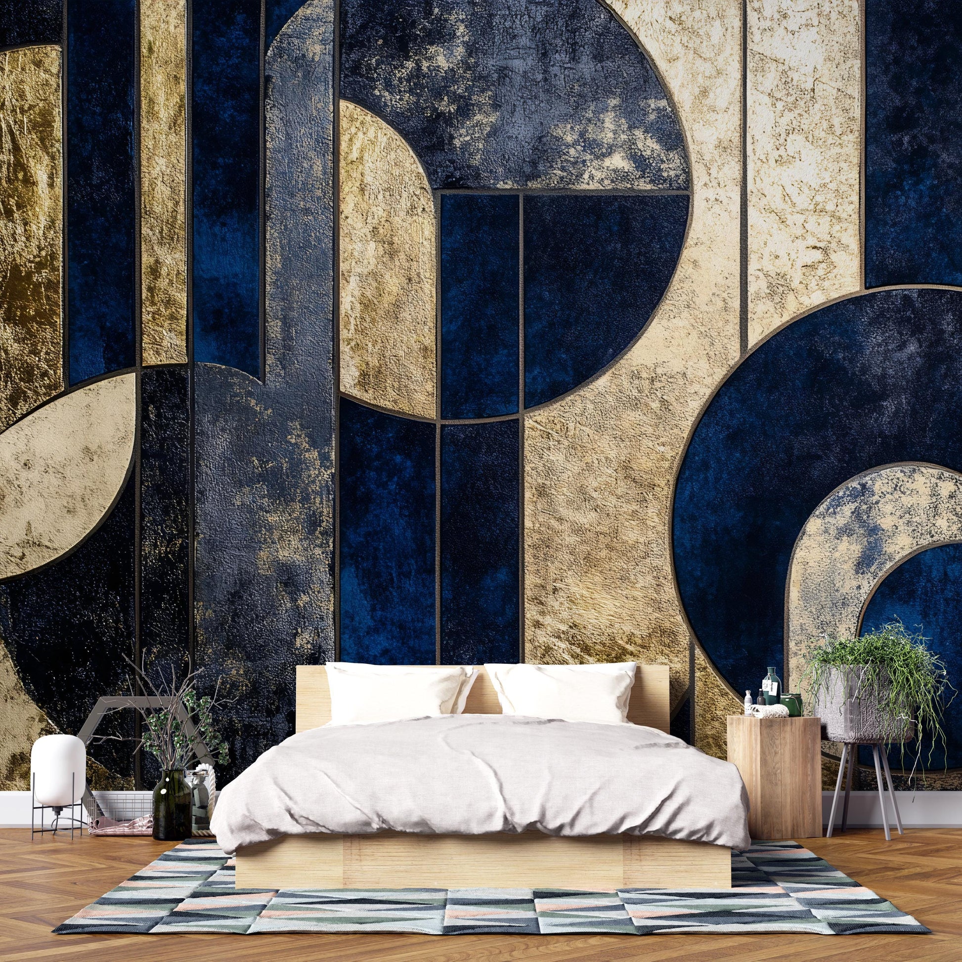 Transform your space with this luxury navy and gold geometric wall mural. The bold art deco-inspired abstract design combines rich navy tones with shimmering gold textures, making it the perfect statement wall for modern interiors.