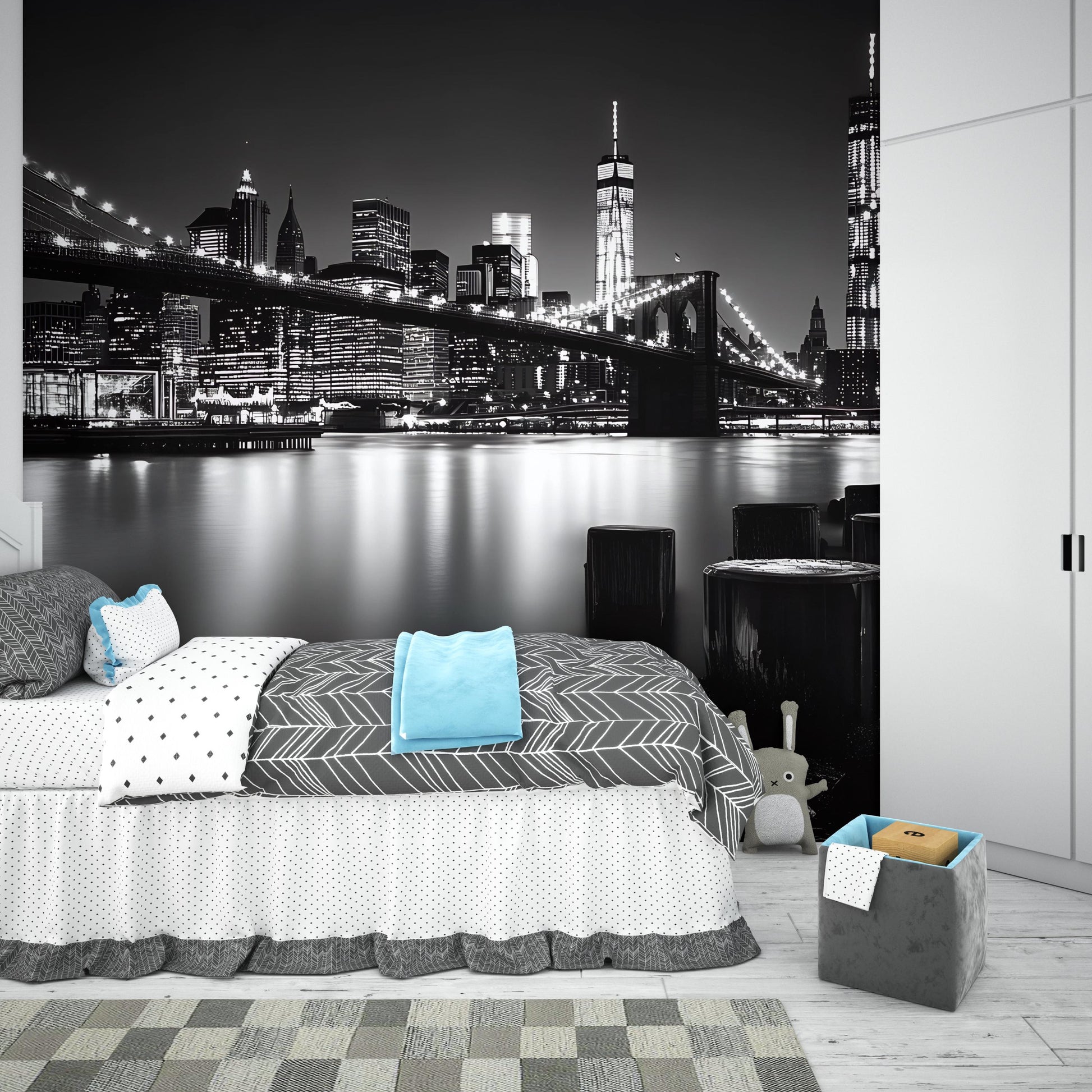NYC Skyline Wall Mural | Black and White Cityscape Wallpaper | Modern Urban Bedroom Decor | Brooklyn Bridge Night Scene