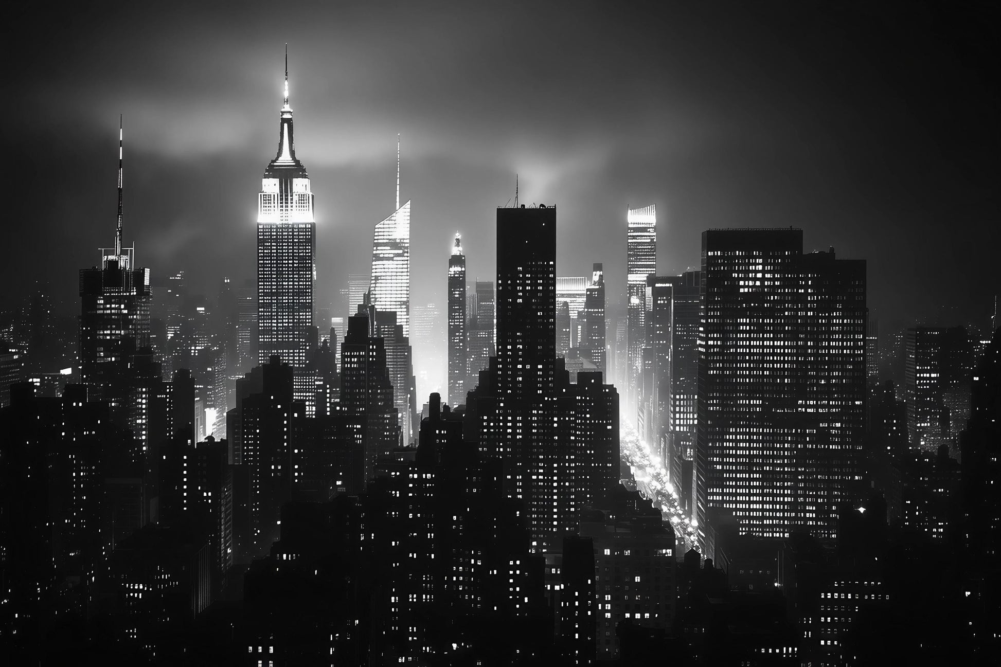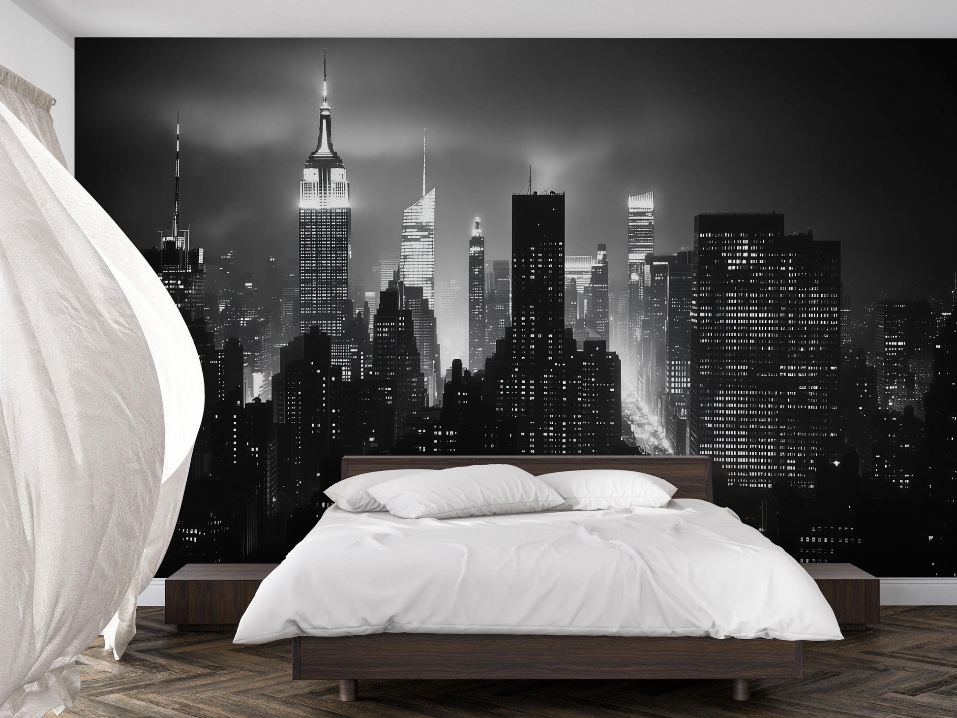 Transform your space with the striking elegance of New York City. This NYC skyline wall mural captures the Empire State Building and Manhattan skyscrapers in a dramatic black-and-white night cityscape.