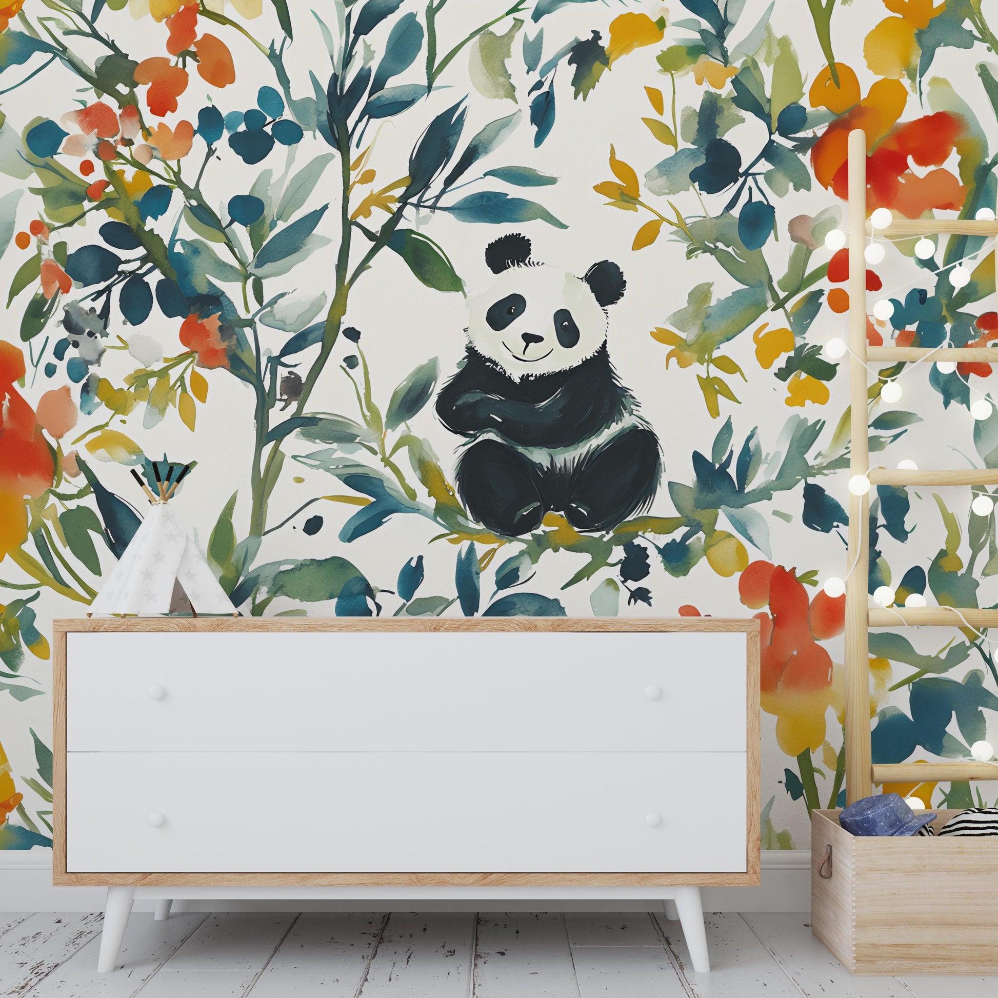 Bring joy and color to your little one’s space with this whimsical panda wall mural! Featuring a hand-painted watercolor panda surrounded by lush botanical leaves and vibrant florals, this design adds a playful yet calming vibe to any nursery, toddler room, or playroom. Printed on high-quality removable wallpaper, it's perfect for renters and easy to install.