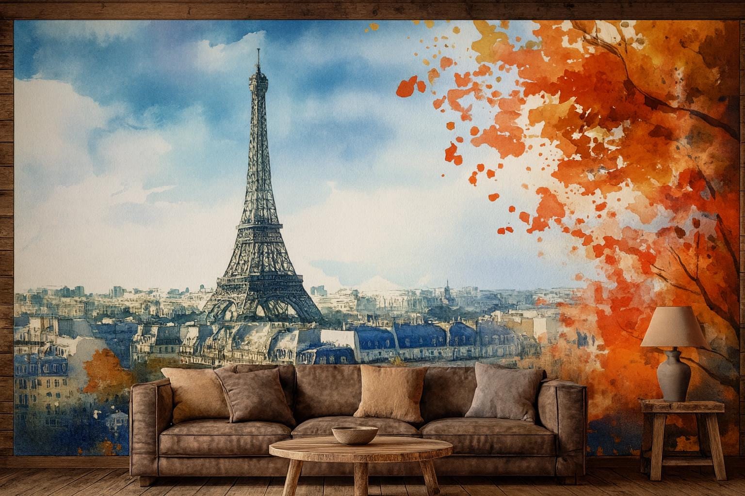 Transform your space with the timeless romance of Paris. This Eiffel Tower watercolor wall mural captures the beauty of the Parisian skyline with rich colors, autumn trees, and soft painterly details. Perfect for creating a romantic and artistic atmosphere, it brings the magic of France into your living room, bedroom, office, or café décor.