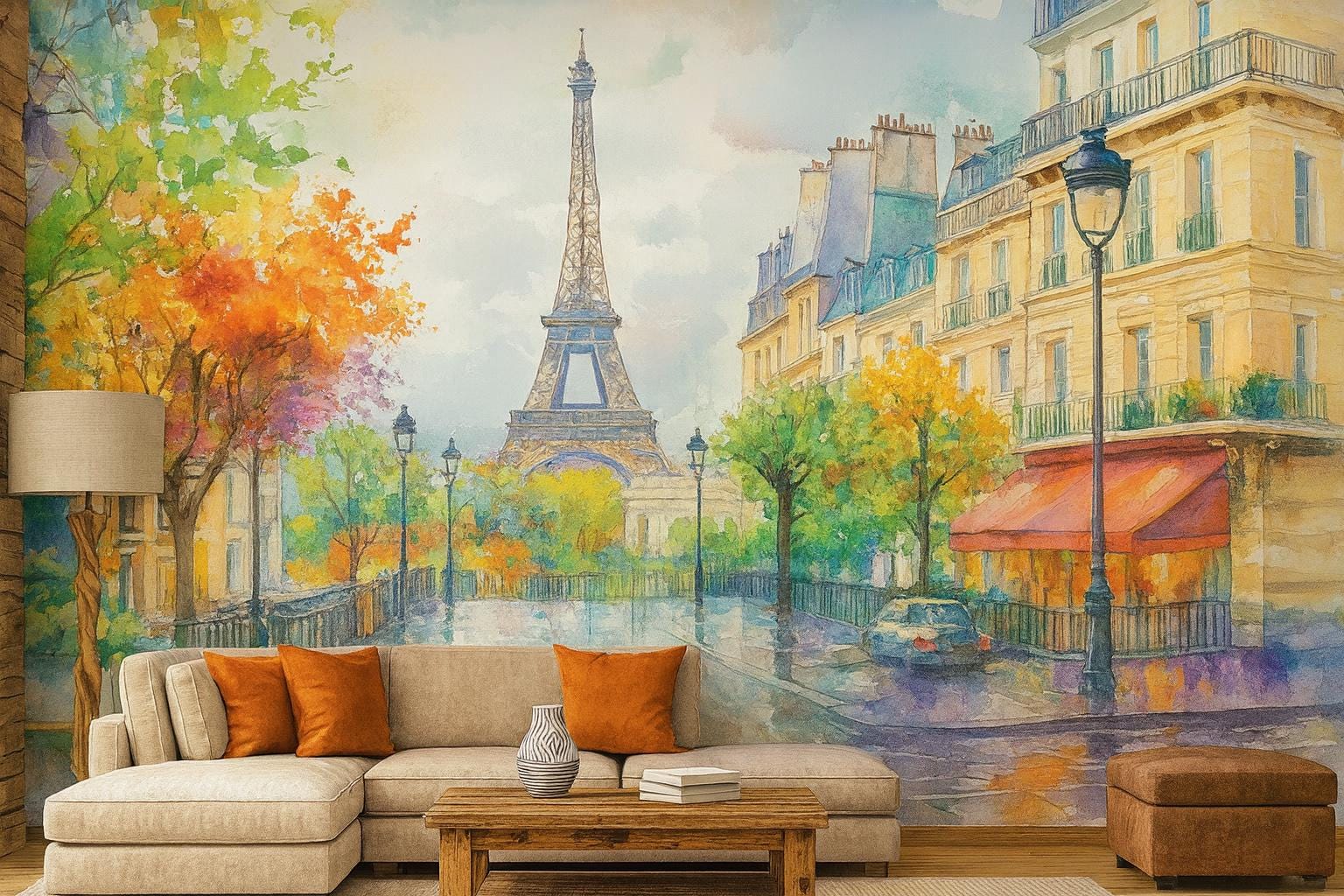 Bring the romance of Paris into your home with this Eiffel Tower watercolor wall mural, featuring a vibrant Parisian street scene with autumn leaves, charming cafés, and the iconic Eiffel Tower rising in the distance. The watercolor artistry adds a soft, dreamy atmosphere that enhances bedrooms, living rooms, dining spaces, or boutique interiors. Perfect for those who love French décor, travel-inspired wall art, and Parisian elegance.