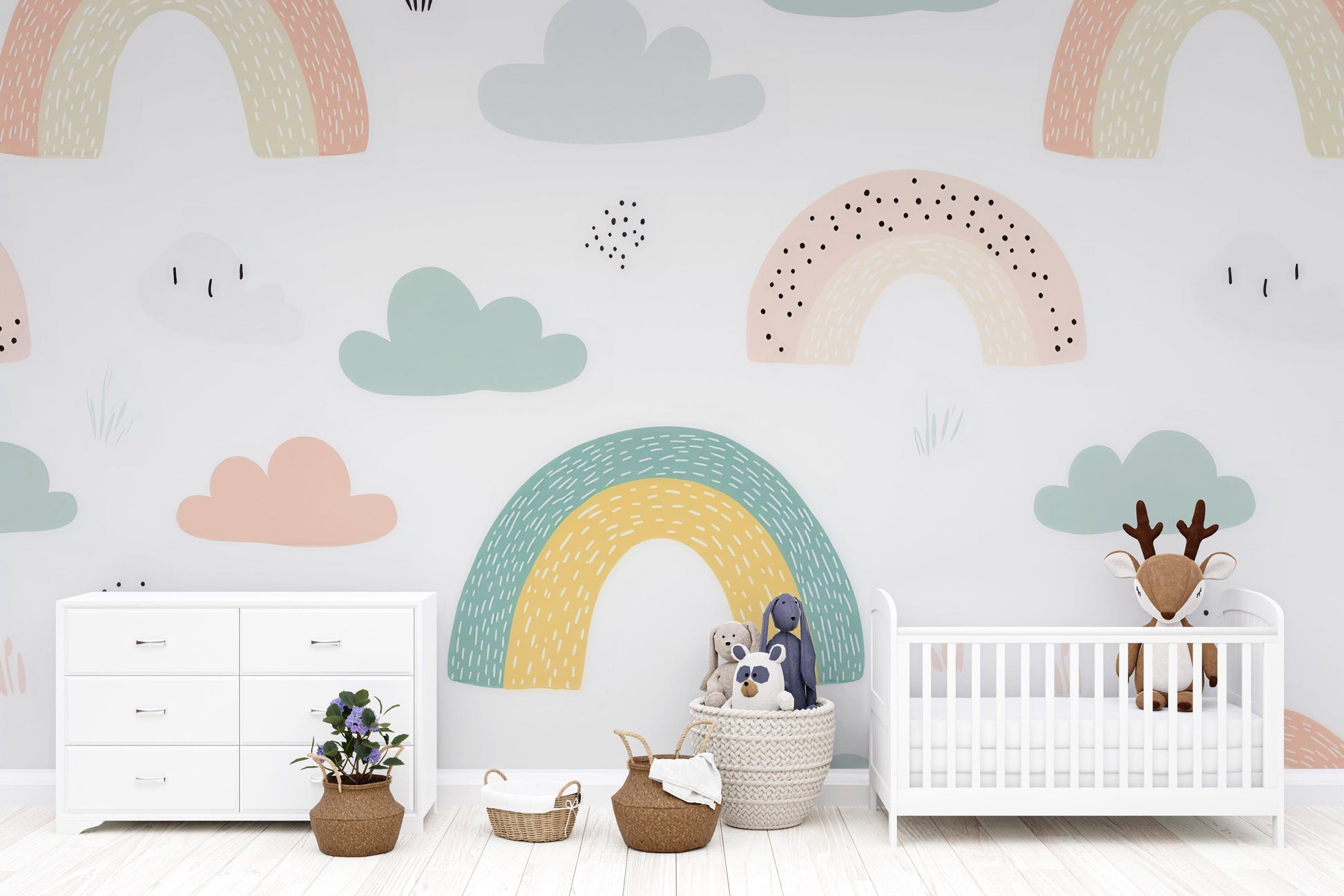Add a touch of whimsy to your child’s room with this pastel rainbow wall mural featuring soft watercolor arches, playful clouds, and subtle hand-drawn accents. The cheerful design makes it perfect for nurseries, playrooms, or kids’ bedrooms, creating a cozy and creative space that inspires joy.