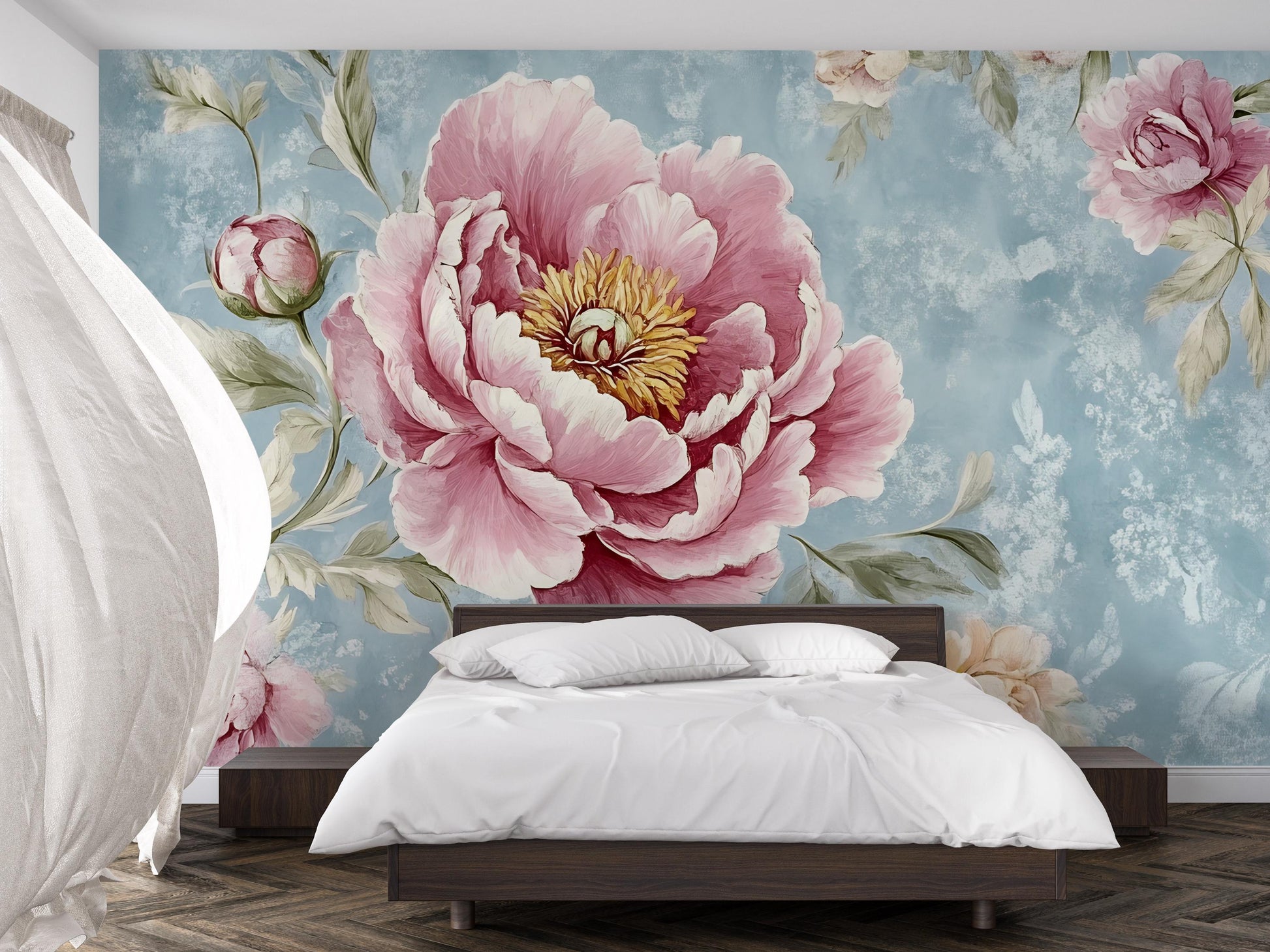 Transform your bedroom into a blooming retreat with this stunning peony flower wall mural. Featuring oversized pink floral artwork on a soft sky-blue background, this mural adds elegance, romance, and tranquility to any space. Perfect for nature lovers and those looking to create a serene sanctuary. Easy to install and available in custom sizes, this mural is ideal for bedrooms, accent walls, or boutique interiors.