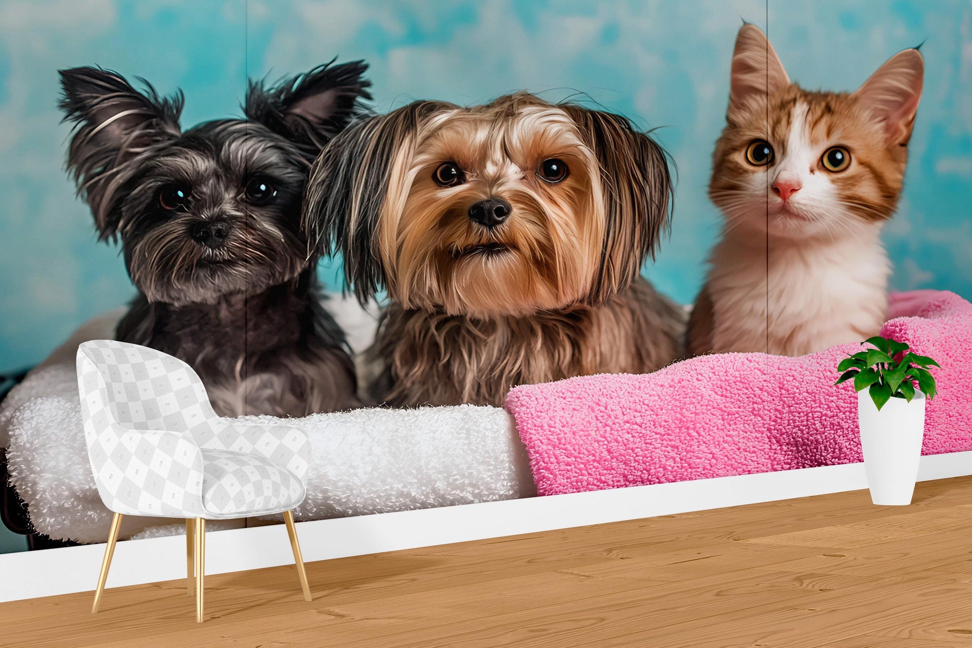 Transform your veterinary clinic or pet care reception area with this heartwarming and professional wall art featuring two adorable dogs and a curious kitten. Perfect for pet groomers, vet offices, or animal shelters, this high-resolution digital print adds a welcoming and comforting atmosphere for pet lovers and clients alike. The stylish design blends modern aesthetics with the warm charm of our furry friends. Ideal for creating a positive first impression in your office space.