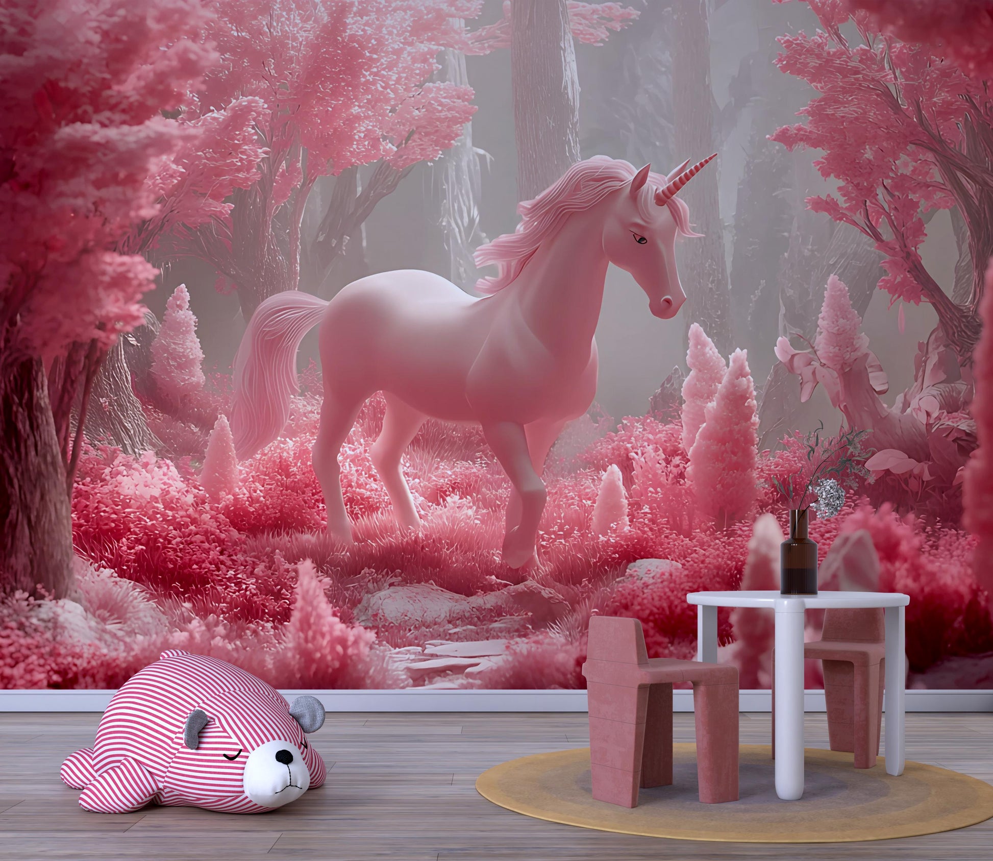 Transform your baby girl's nursery into a magical dreamland with this Pink Unicorn Wall Mural. Featuring a graceful unicorn in a pastel pink enchanted forest, this high-quality wallpaper adds whimsy and wonder to any space. Perfect for newborn nurseries, toddler rooms, or dreamy playrooms.