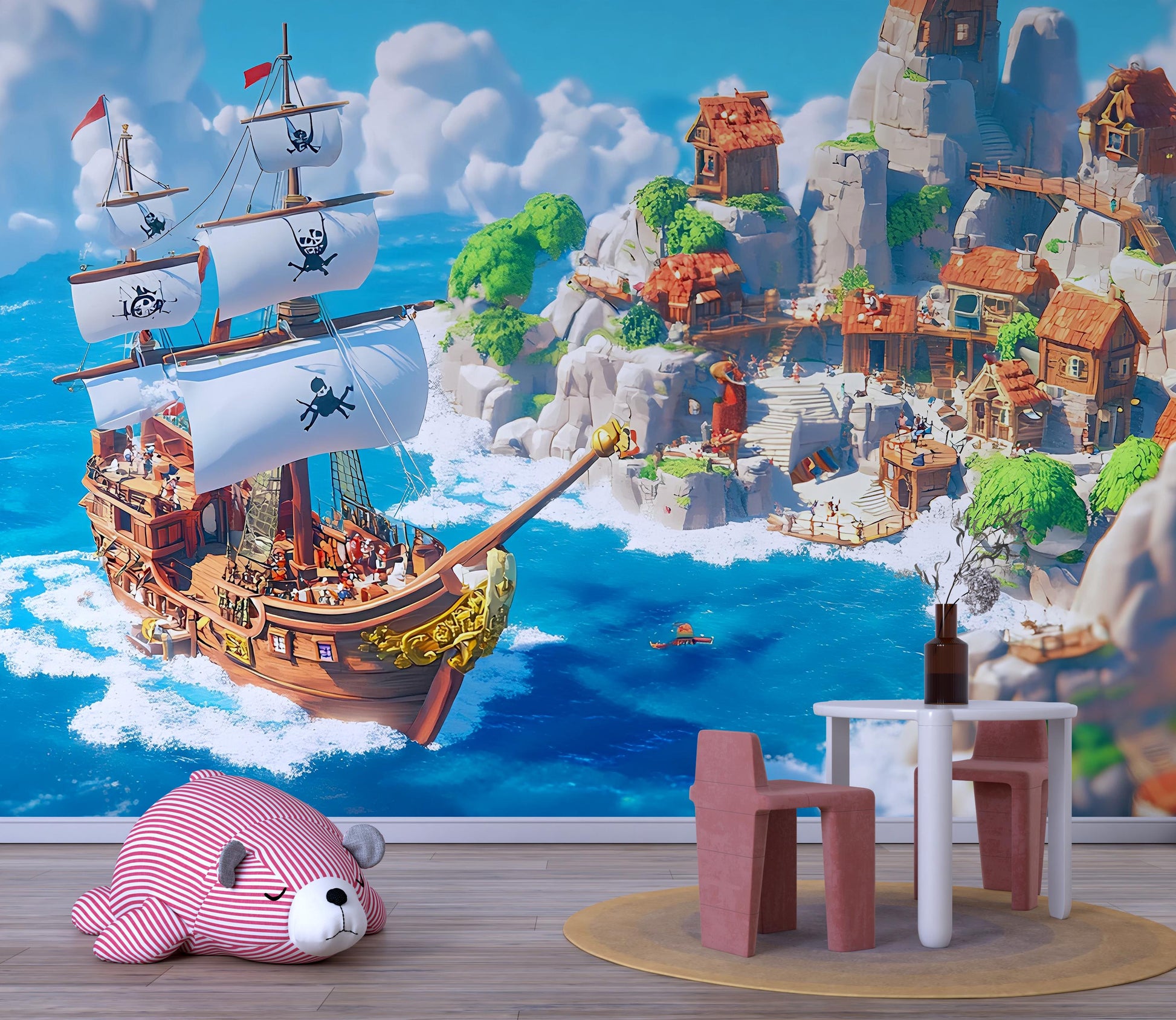 Bring a wave of imagination to your child's room with this vibrant pirate ship wall mural! Featuring a beautifully illustrated ship and a whimsical island village, this wallpaper sets the perfect scene for adventure. Ideal for nurseries, playrooms, or classrooms, it's designed to spark creativity and fun. Printed in high resolution with eco-friendly inks, this mural adds a bold statement to any space.