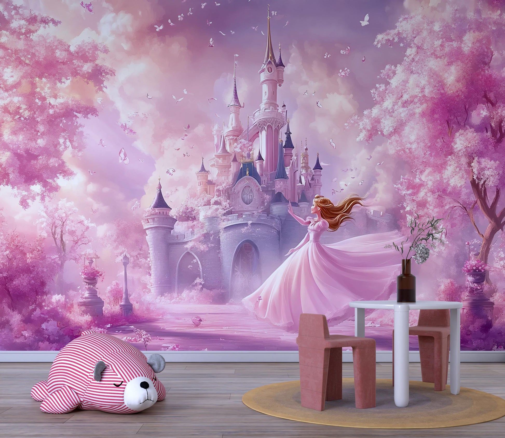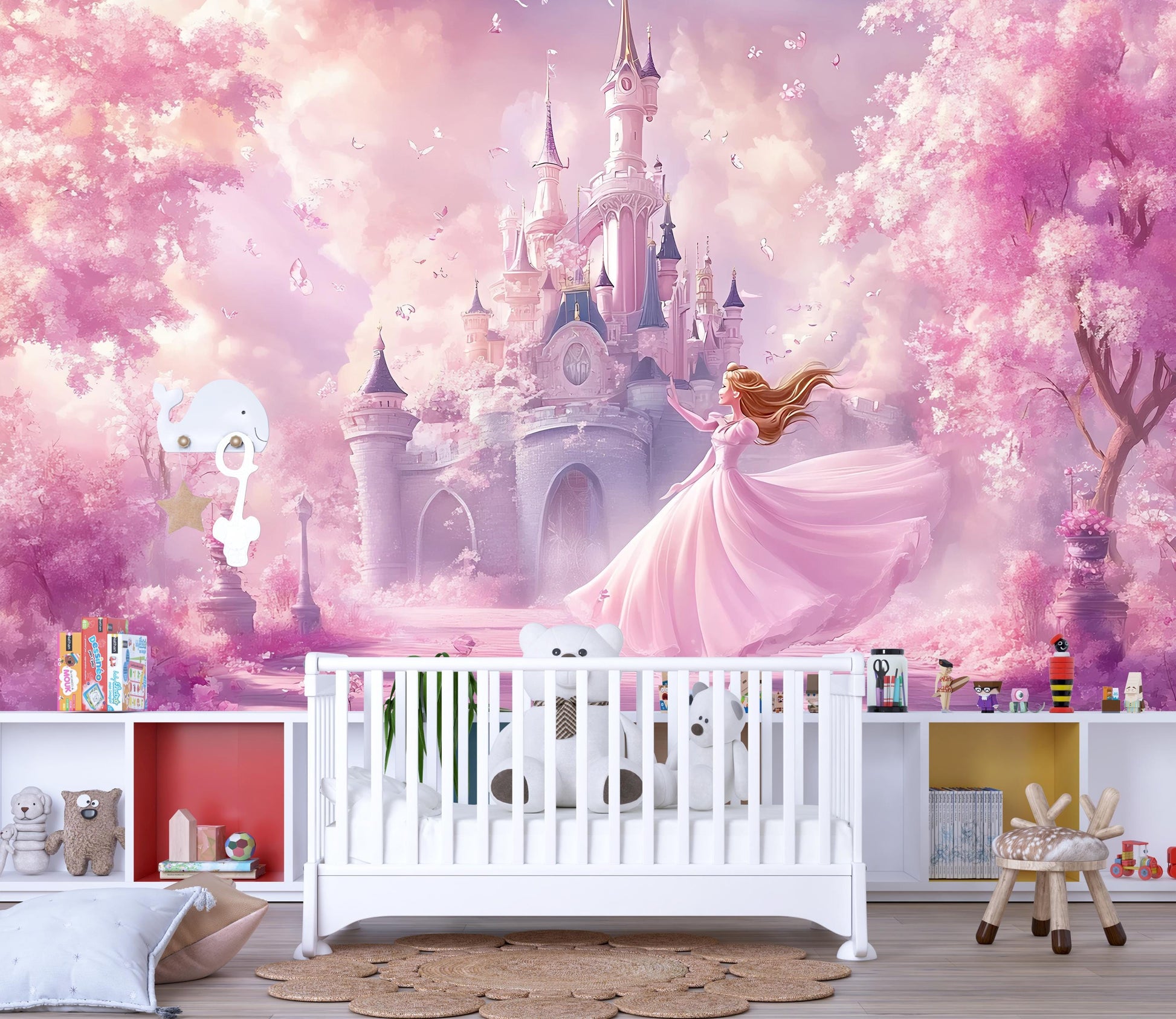 Transform your child's room into a magical kingdom with this enchanting pink princess castle wall mural. Featuring a dreamy fantasy castle surrounded by cherry blossom trees and a flowing princess in a ball gown, this wallpaper adds a fairy tale charm to any space. Perfect for girls' bedrooms, nurseries, or playrooms, this high-resolution mural creates a whimsical and imaginative environment for storytelling and play.