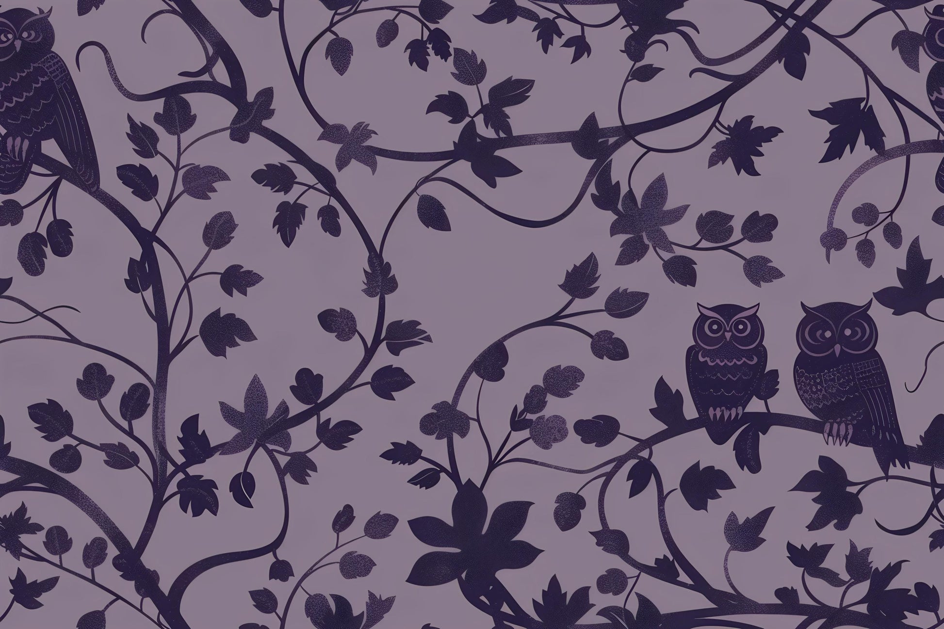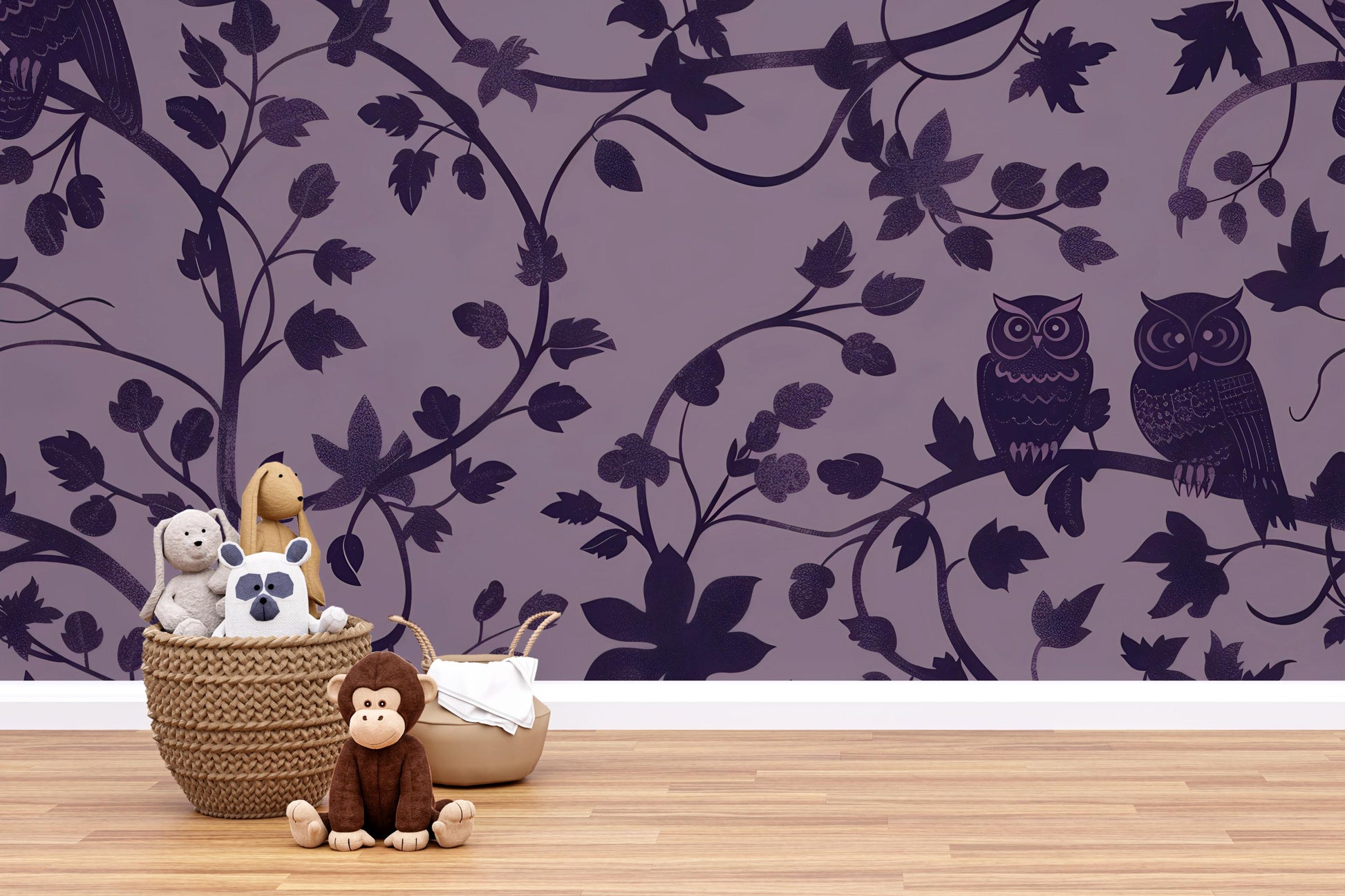 Transform your walls into a whimsical nighttime forest scene with this Purple Owl Wallpaper. Featuring playful owls perched among flowing vines and leaves on a deep purple backdrop, this mural adds charm and character to any room.