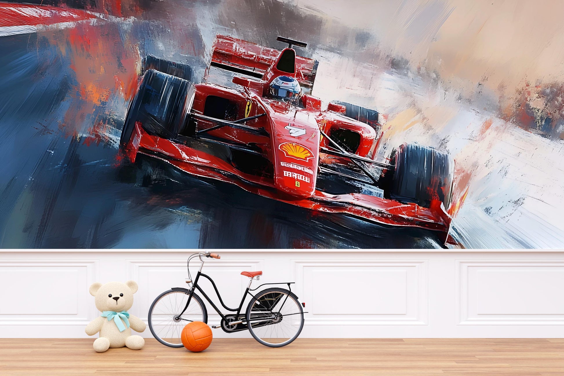 Race Car Wall Mural for Boys Room – Red Formula 1 Style Kids Decor, Sports Car Wallpaper, Racing Bedroom Theme Art