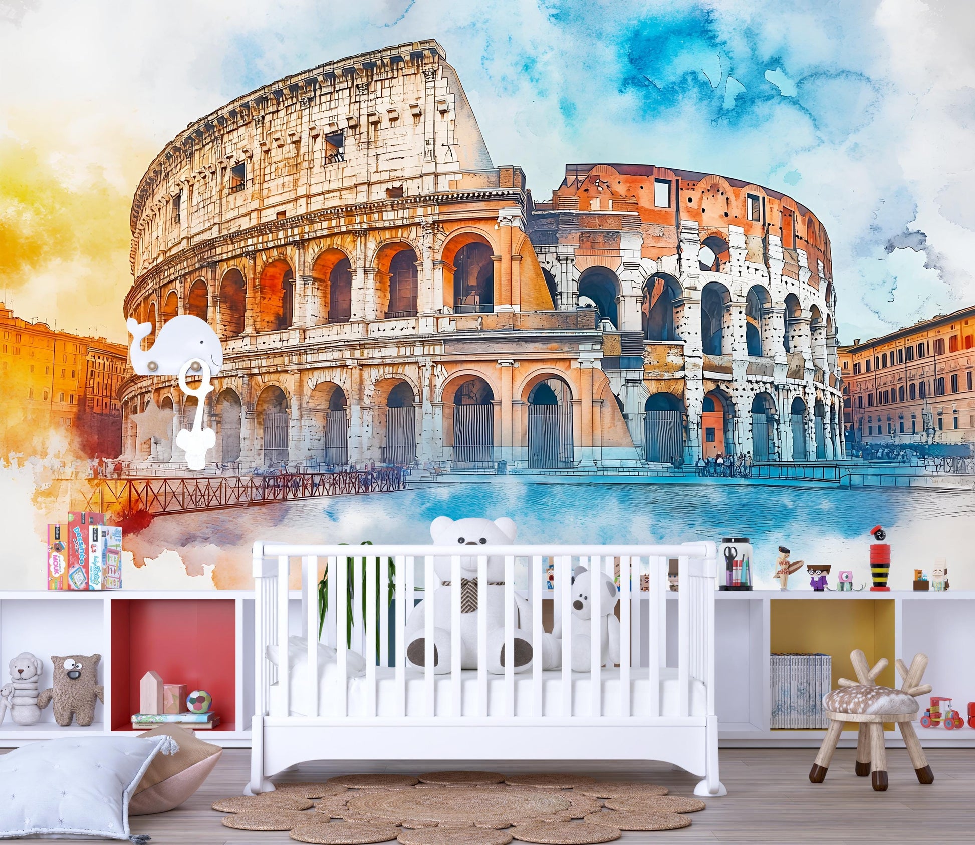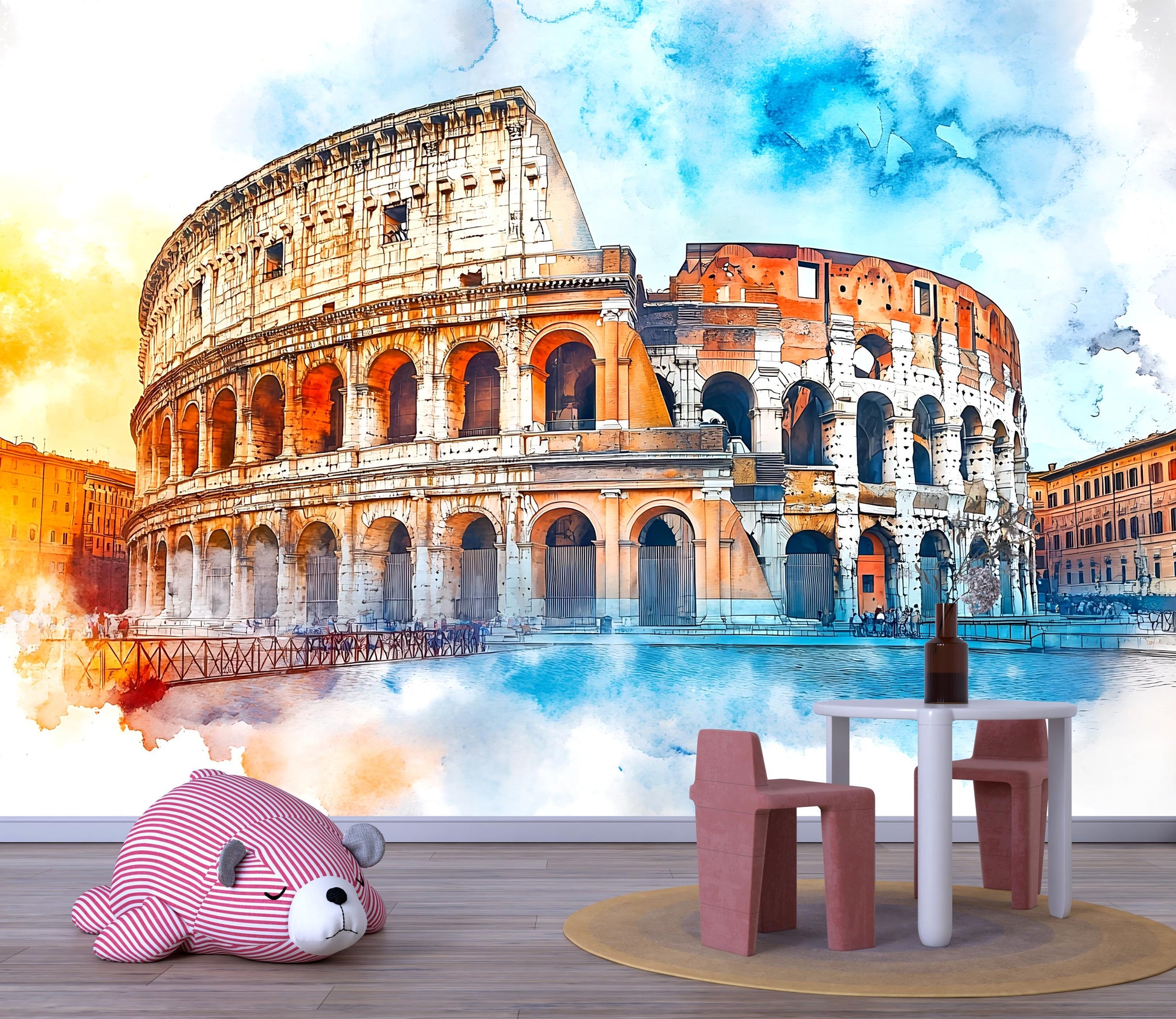 Transform your walls with the legendary beauty of Rome’s Colosseum, captured in vibrant watercolor style. This ancient landmark mural blends warm terracotta hues with cool blue skies, creating a bold centerpiece for any space.