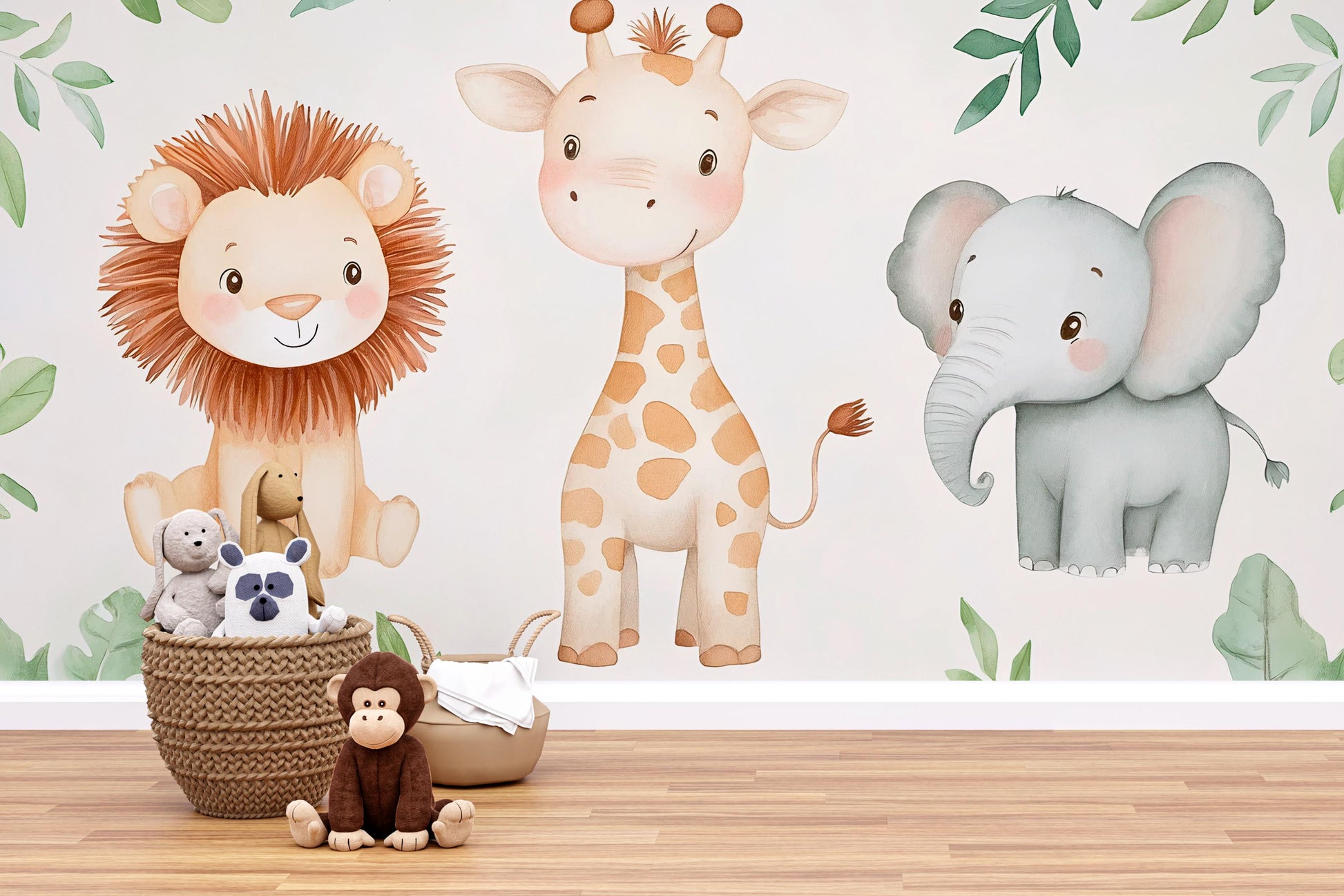 Transform your nursery into a cozy safari with this adorable animal wall mural. Featuring a happy lion, sweet giraffe, and gentle elephant surrounded by soft green jungle leaves, this mural brings warmth and charm to any child’s room.