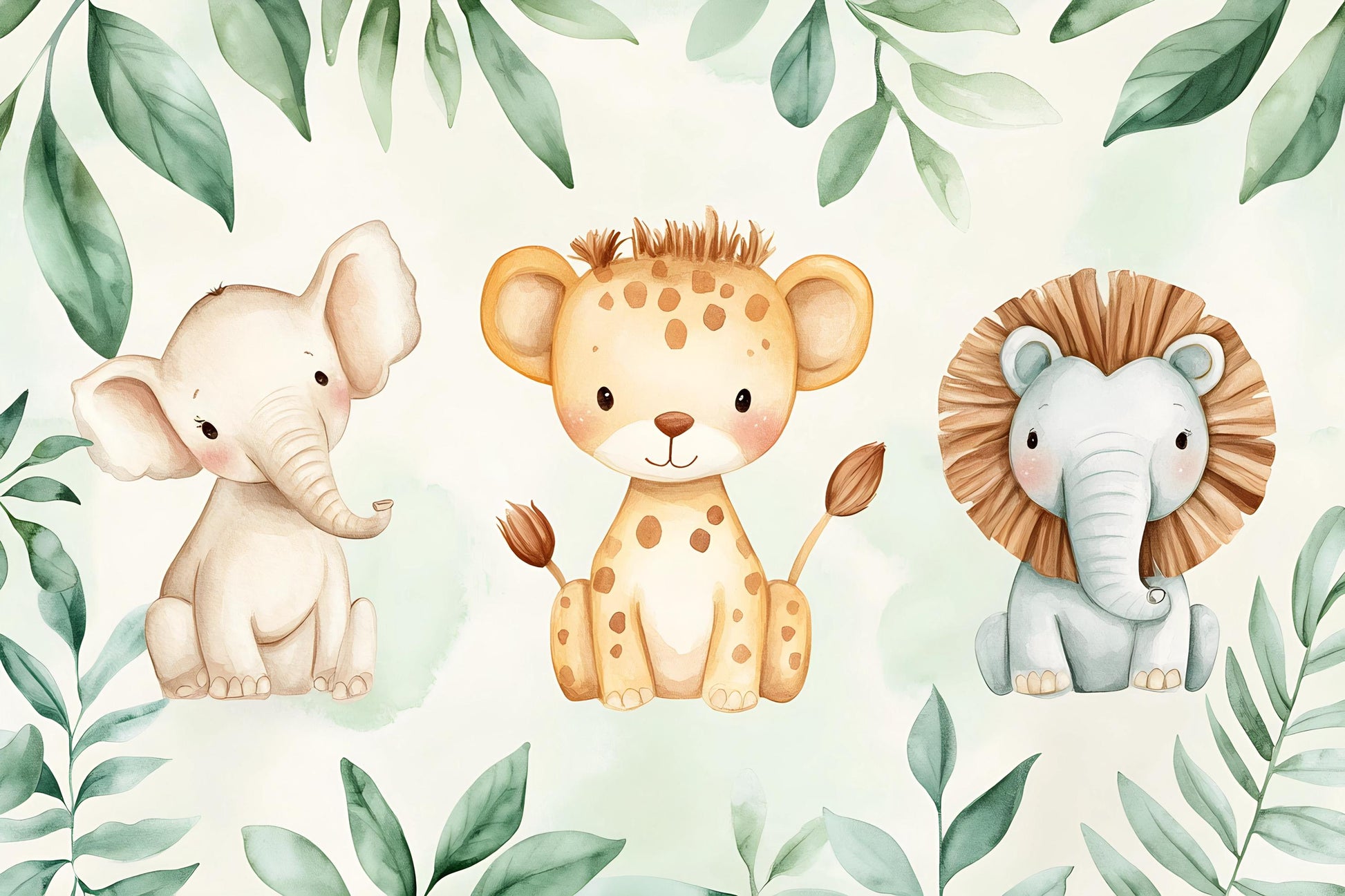 Create a playful and cozy nursery with this adorable safari animal wall mural. Featuring a sweet elephant, cheerful leopard, and a lion with a leafy jungle background, this design brings warmth, charm, and adventure into your child’s space.