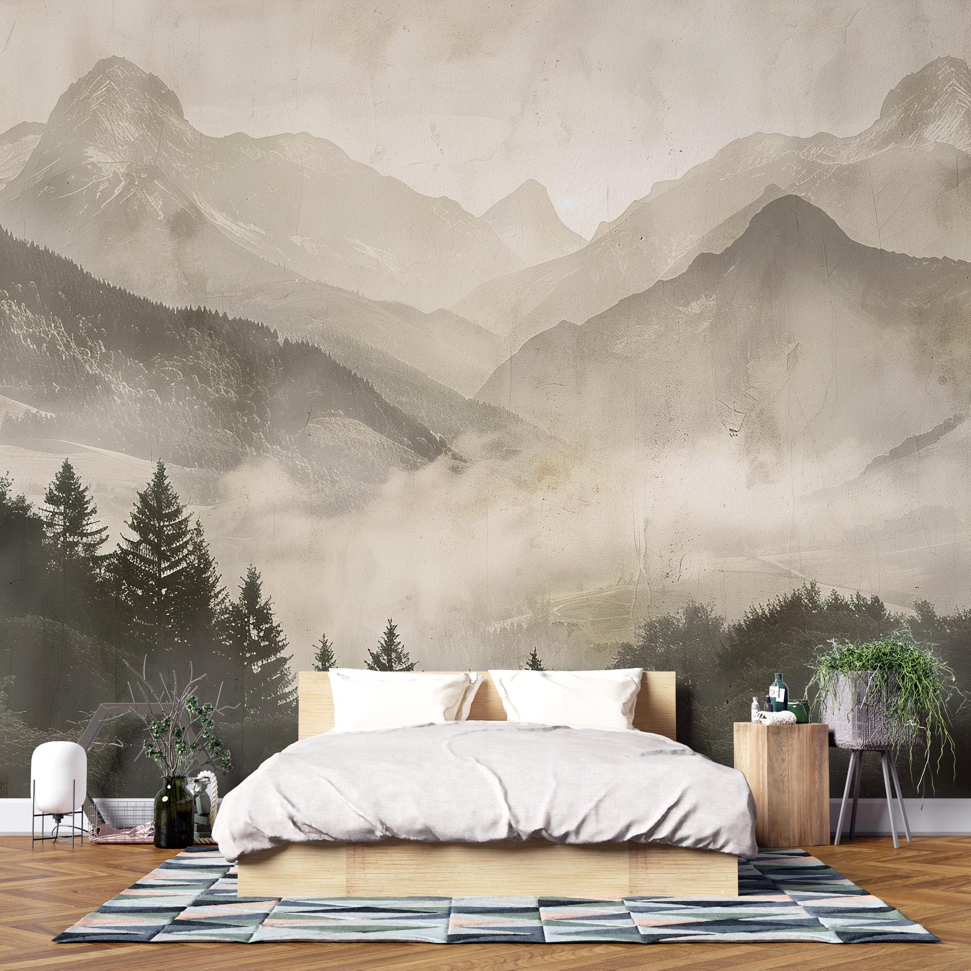 Transform your space with this sepia-toned mountain wall mural, featuring layered peaks, misty fog, and evergreen forest silhouettes. The muted vintage tones create a timeless, calming, and elegant statement wall that blends seamlessly with both modern and rustic interiors.