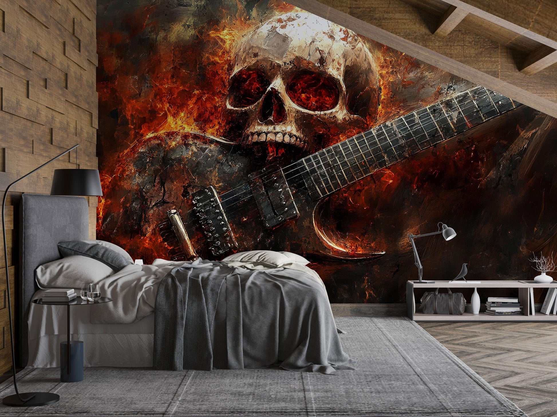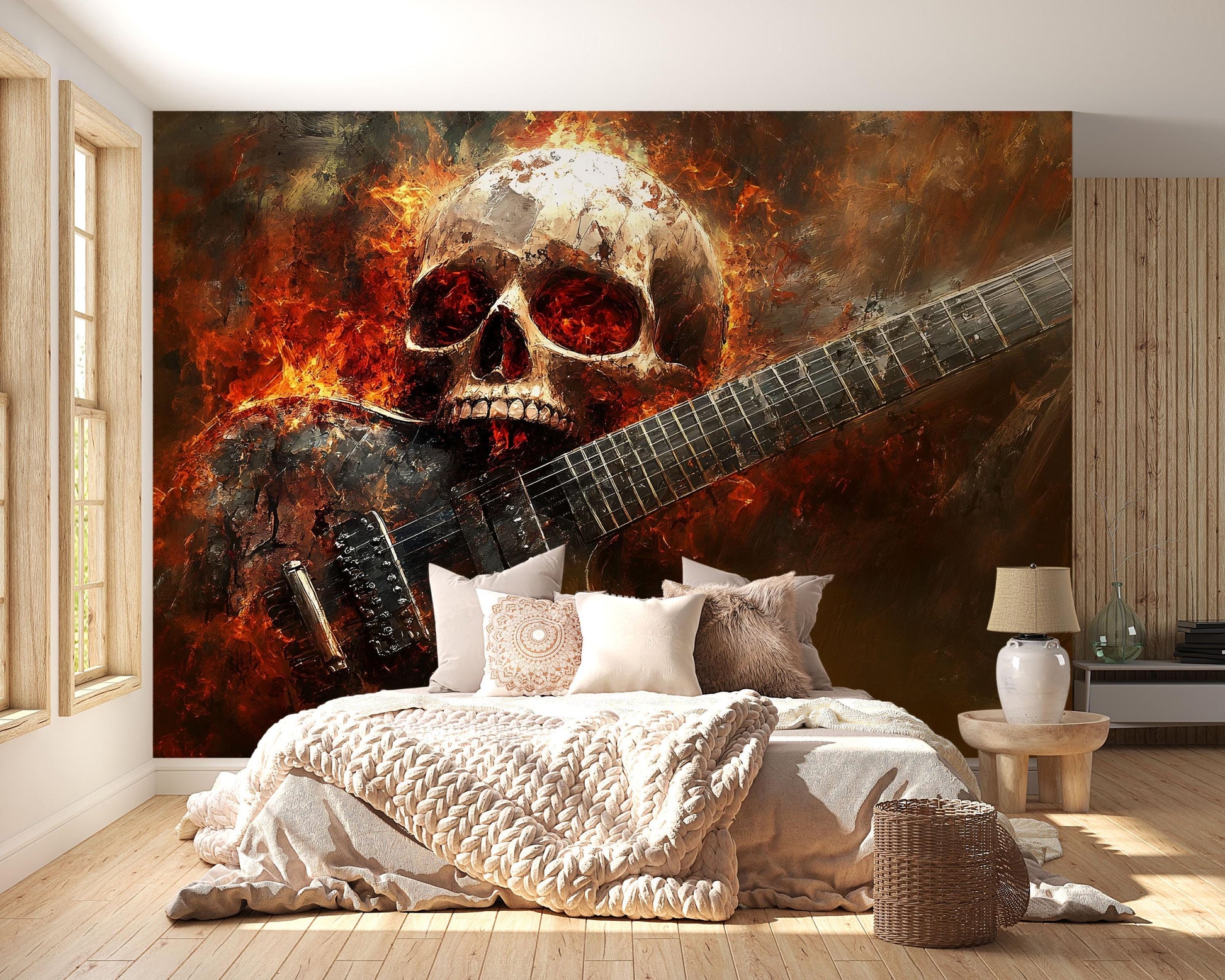 Skull & Guitar Fire Wall Mural – Heavy Metal Rock Bedroom Art Decor