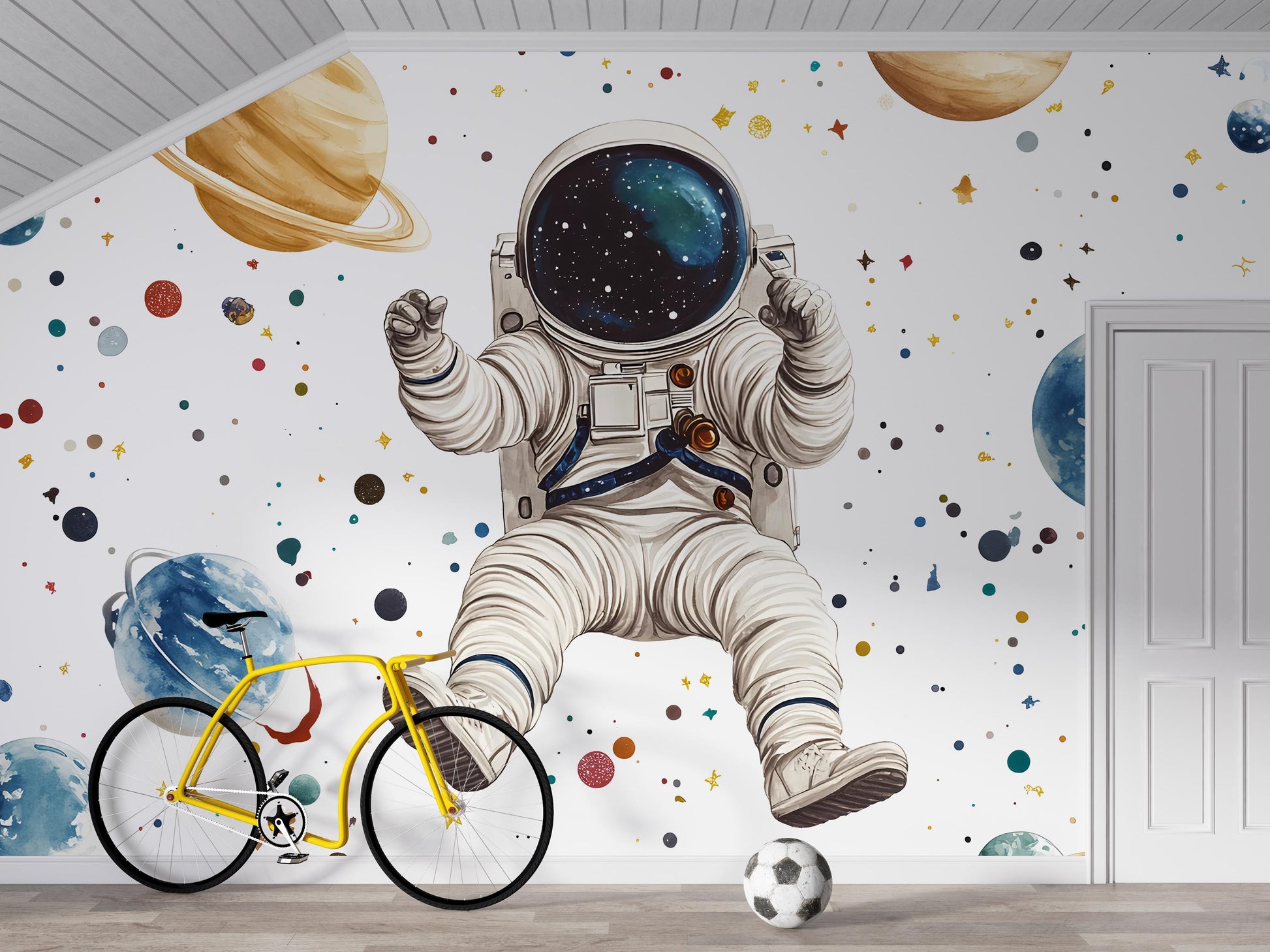 Transform your child’s room into an out-of-this-world adventure with this stunning space-themed astronaut wall mural. Featuring a playful astronaut surrounded by colorful planets, stars, and galaxies, this design is perfect for inspiring young imaginations. Ideal for nurseries, toddler bedrooms, or playrooms, this high-quality print brings the wonders of space indoors. Makes a perfect baby shower or birthday gift!