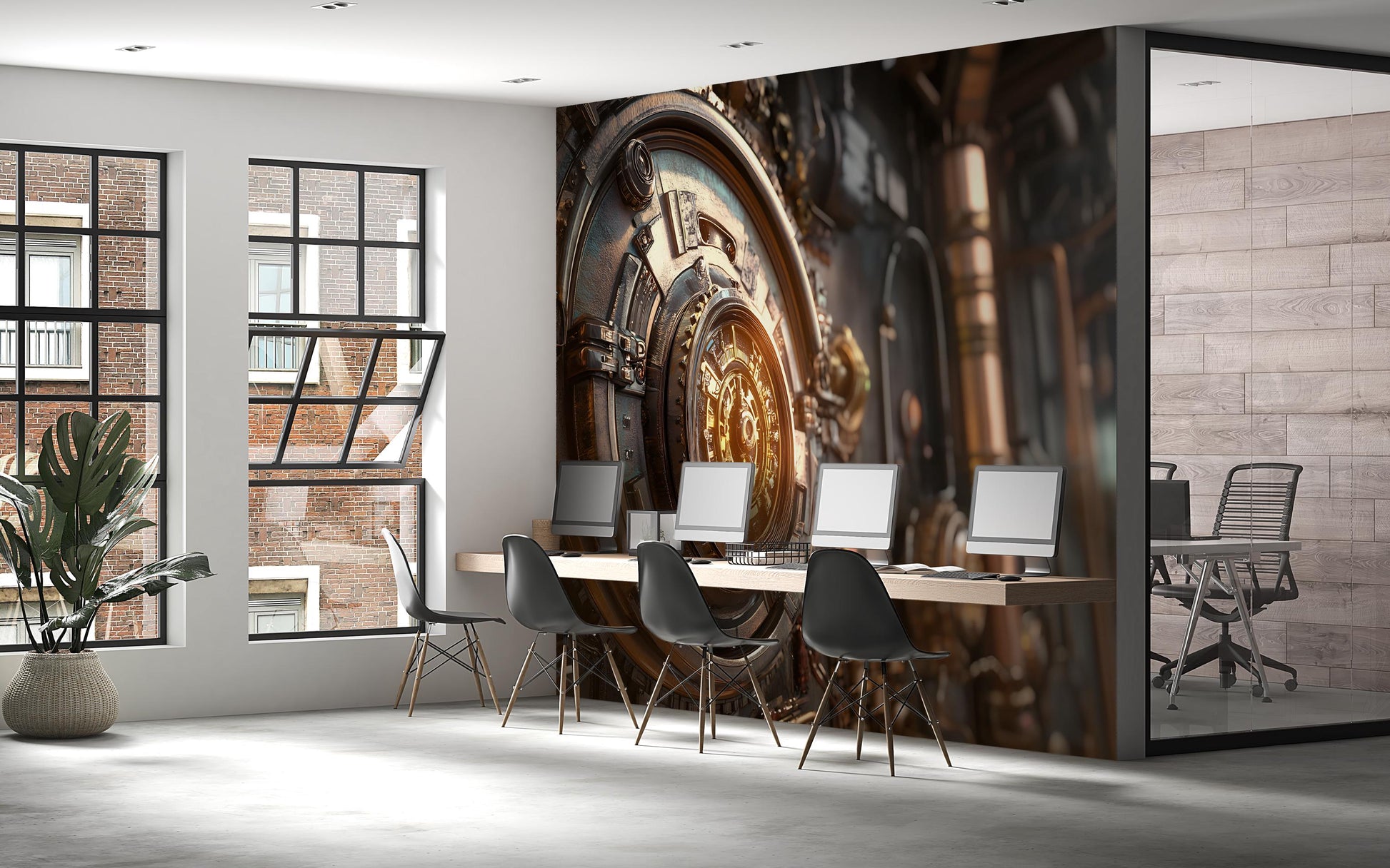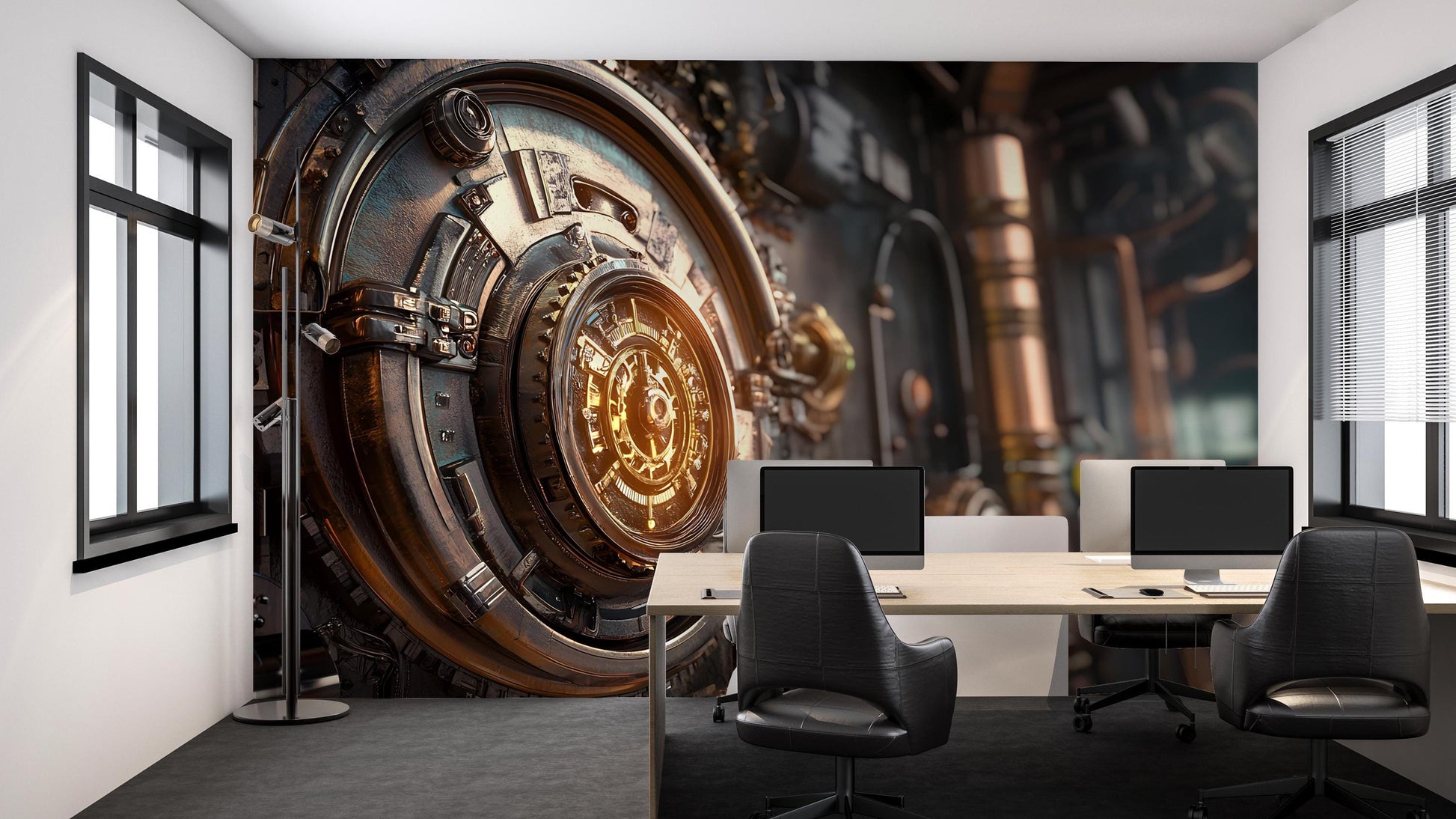 Transform your workspace with this high-resolution Steampunk Vault Wall Mural, perfect for modern office environments or tech-inspired interiors. Featuring a highly detailed, golden mechanical vault door against an industrial backdrop, this digital artwork adds depth, sophistication, and a futuristic edge to your décor.