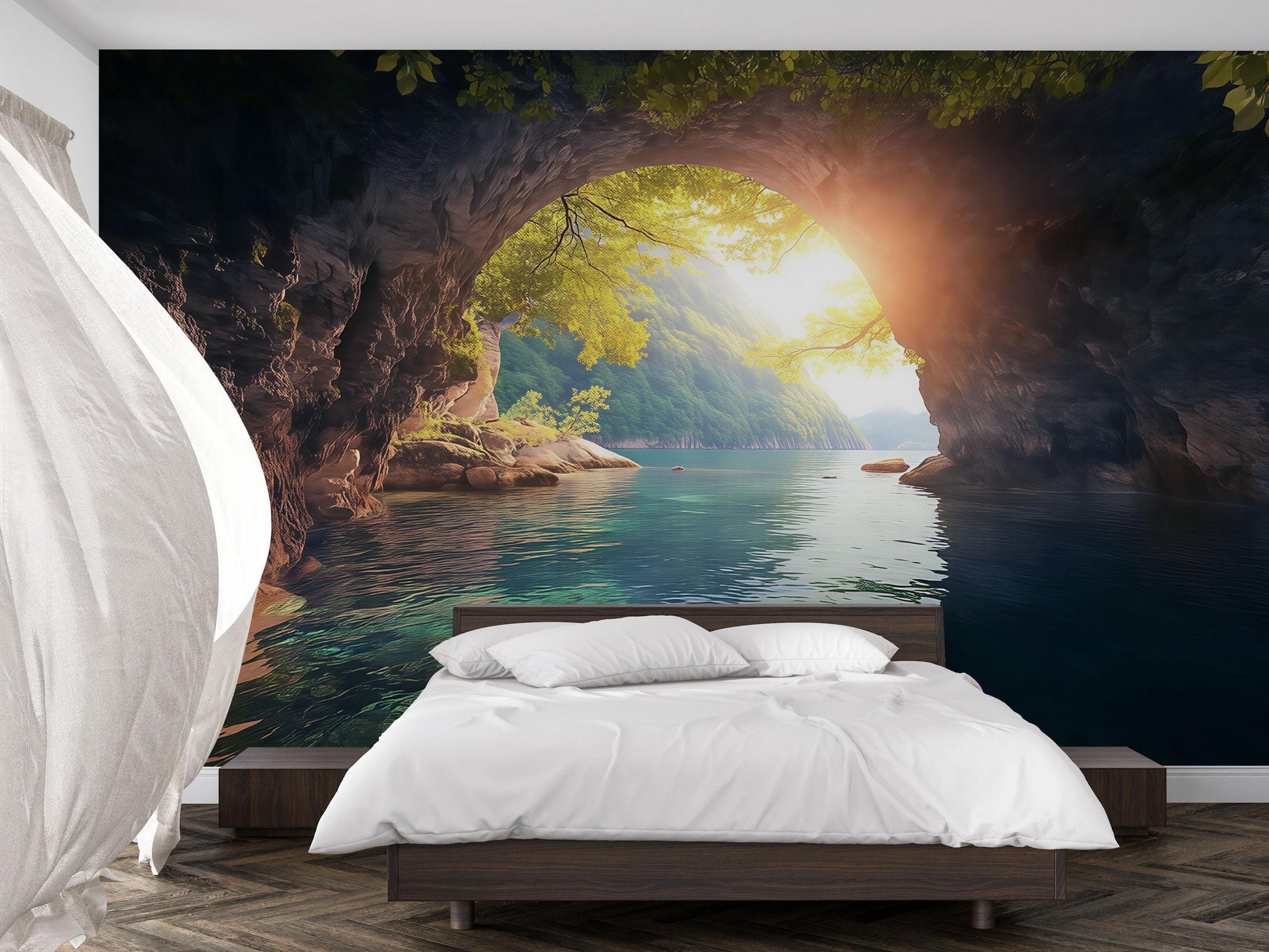 Sunlit Cave Wall Mural – Nature Landscape Wallpaper for Bedroom Decor