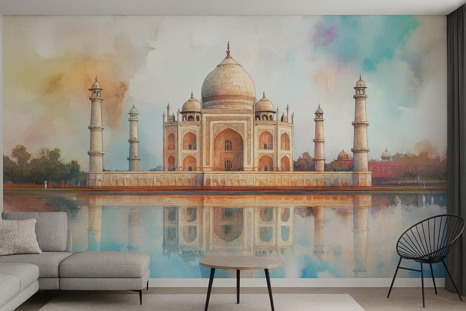 Bring timeless beauty into your home with this Taj Mahal mural wallpaper, a stunning watercolor-style depiction of India’s most iconic landmark. Known as the monument of love, this artwork captures the elegance of Mughal architecture with delicate details and soft pastel reflections in the water. Perfect for living rooms, bedrooms, offices, or meditation spaces, this mural creates a serene and inspiring atmosphere.