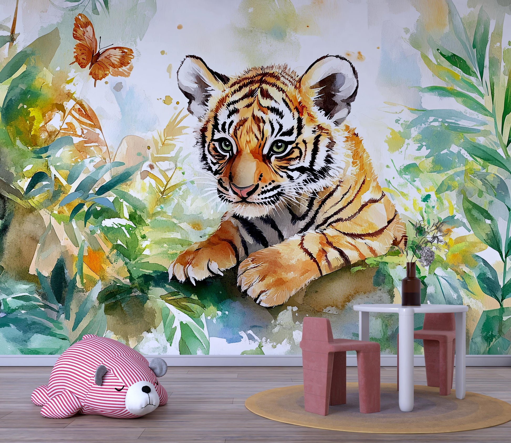 Transform your child's room into a vibrant jungle with this adorable watercolor tiger cub mural! Featuring a playful tiger surrounded by lush foliage and a butterfly, this wall art sparks imagination and warmth. Ideal for nurseries, playrooms, or toddler spaces, it combines artistic charm with cozy decor. High-resolution design for a vivid, lasting impression. Makes a perfect gift for baby showers or animal-loving kids!