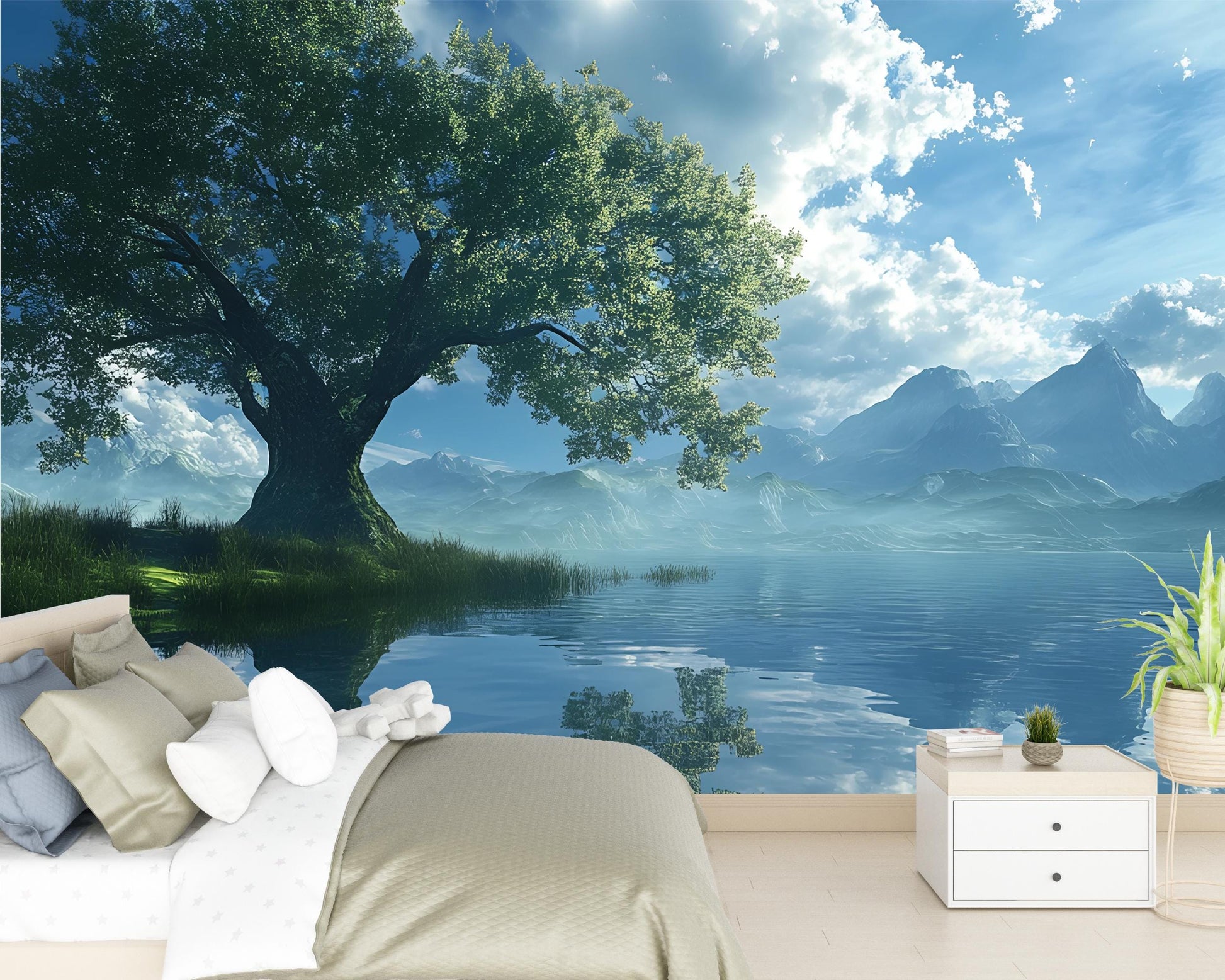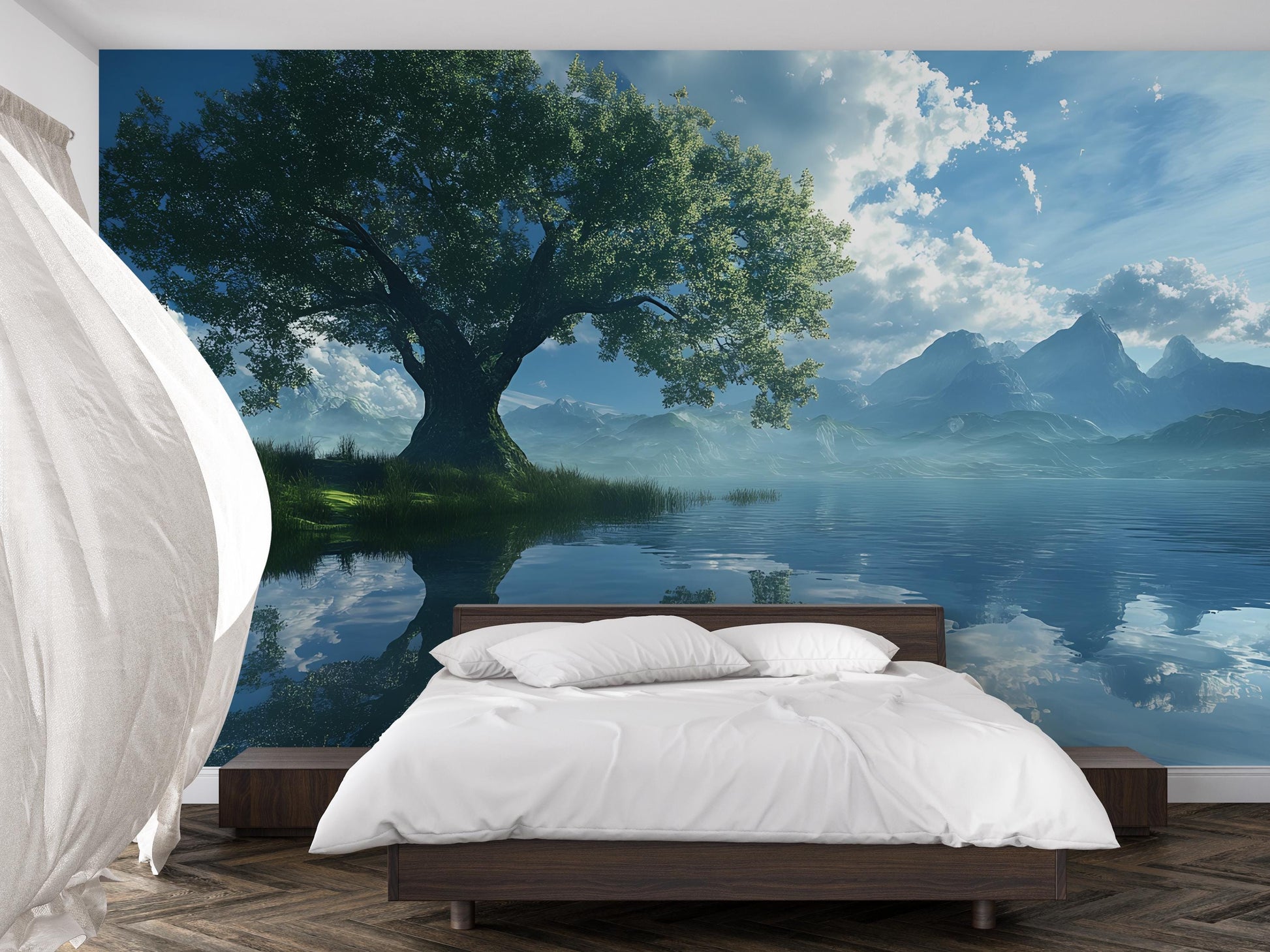 Transform your space into a serene escape with this Tranquil Lake Tree Wall Mural. Featuring a stunning landscape of a majestic tree beside a reflective lake, set against distant mountains and a sky full of light, this high-resolution mural adds depth, calm, and natural beauty to any room.