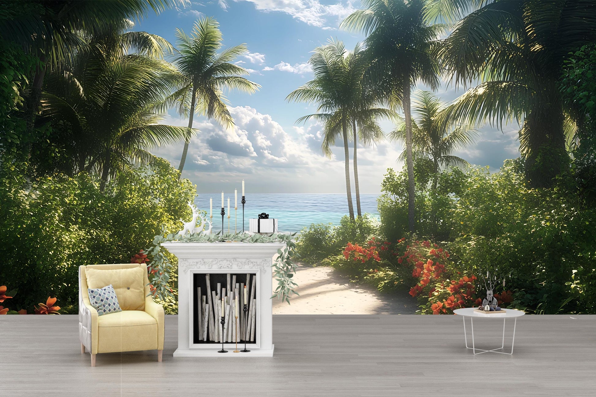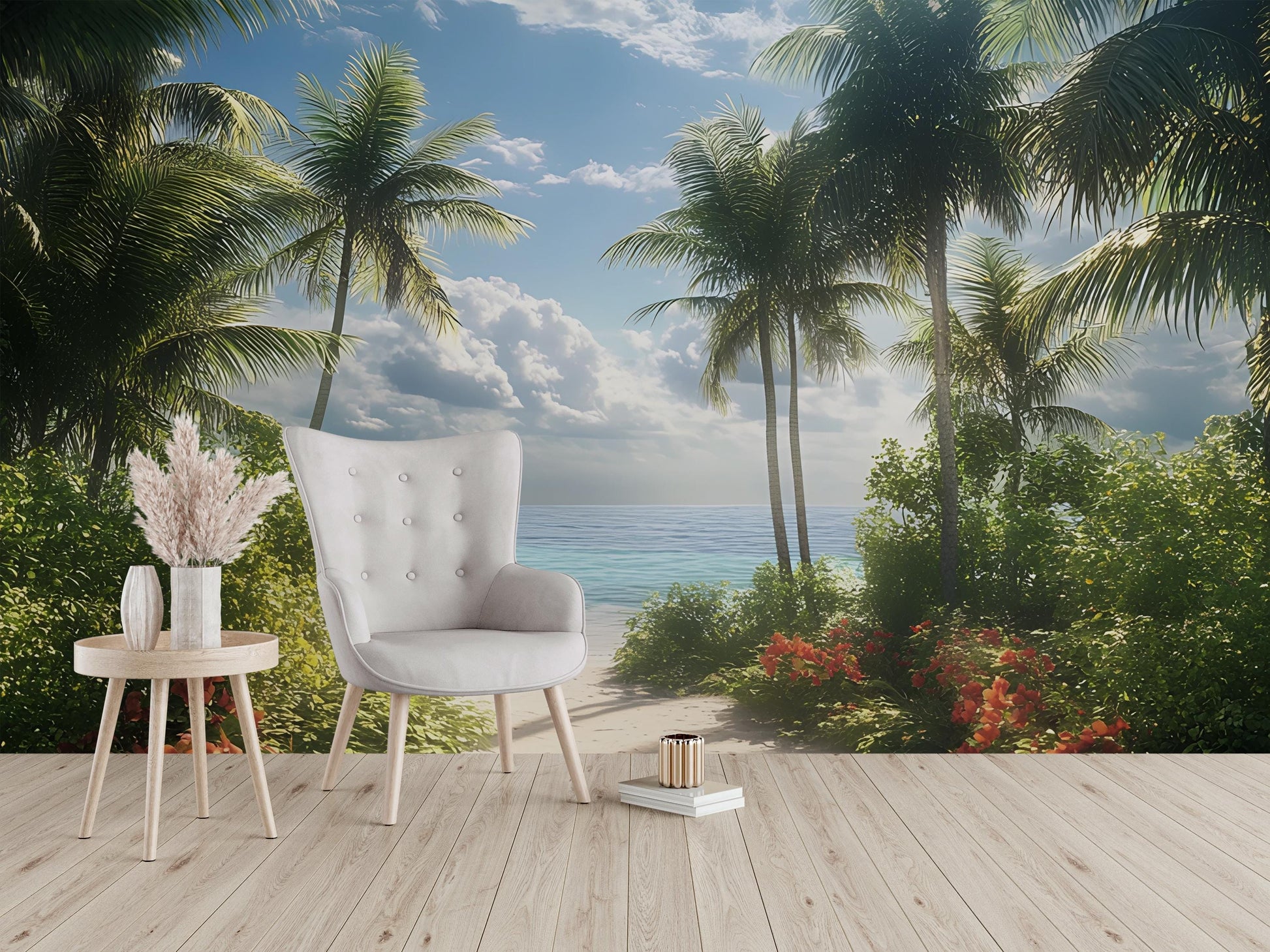 Tropical Beach Wall Mural | Ocean View Palm Tree Wallpaper | Coastal Jungle Scenic Removable Wall Art