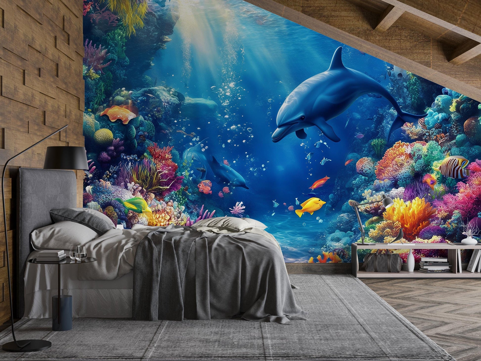 Transform your space with this stunning underwater ocean wall mural featuring vibrant coral reefs, playful dolphins, and colorful tropical fish. Perfect for ocean lovers, this 3D aquatic wallpaper brings the magic of the sea right into your bedroom, kids' playroom, or creative space. Printed in high-definition, the mural offers depth and realism that captivates the eye and inspires the imagination.