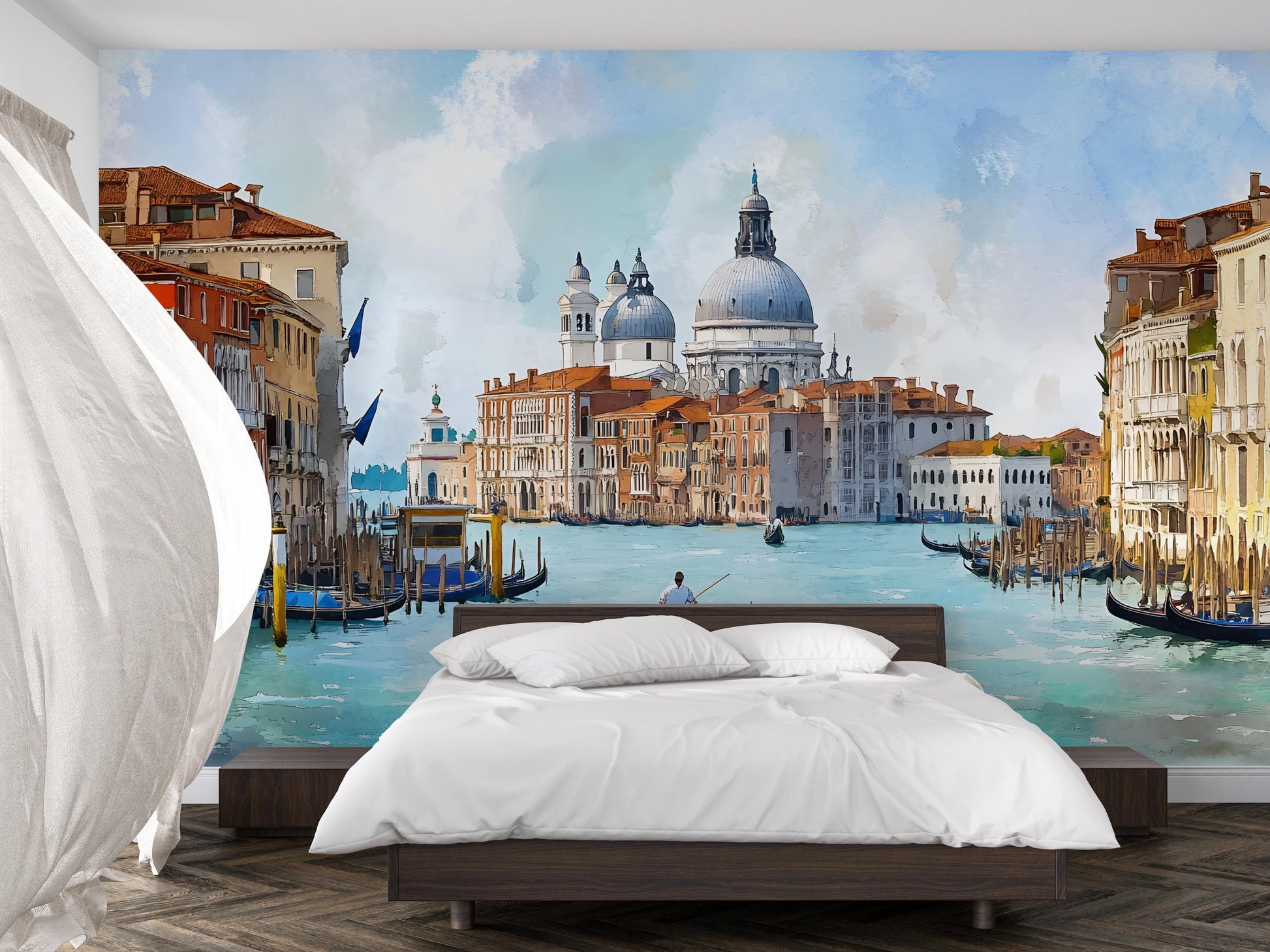 Bring the charm of Italy into your home with this Venice Canal Wall Mural, featuring a breathtaking watercolor-style cityscape of gondolas, historic palaces, and the stunning Basilica di Santa Maria della Salute. This mural blends romance, travel, and art, creating a dreamy focal point for your living room, dining room, or office.