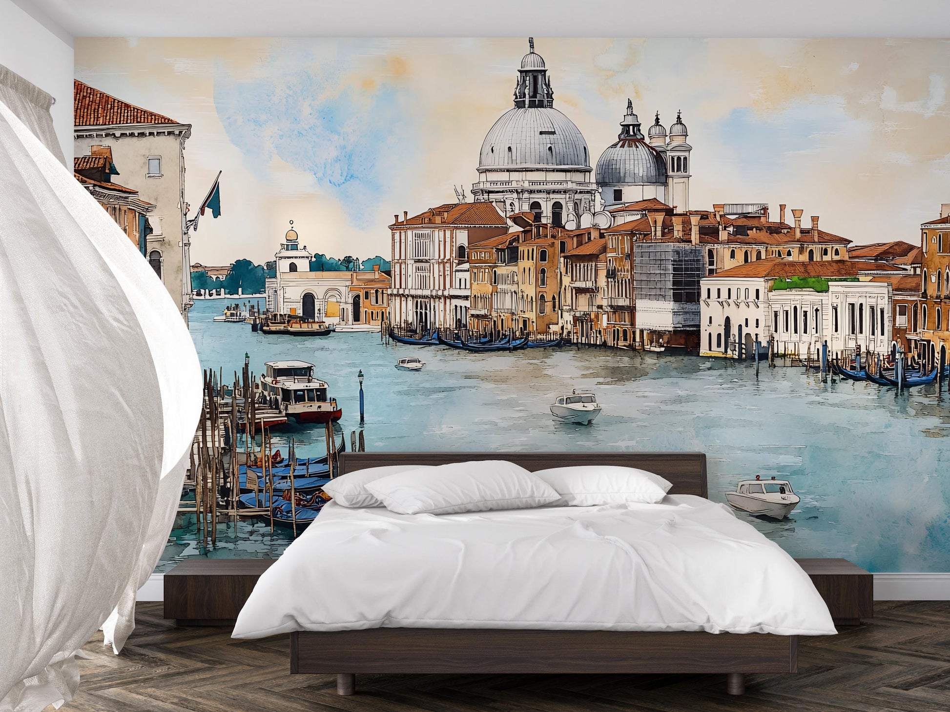 Bring the romance of Venice, Italy into your home with this breathtaking Grand Canal Basilica mural. Featuring gondolas, terracotta architecture, and the iconic domes of Santa Maria della Salute, this watercolor-inspired wall art captures the essence of Venetian charm.