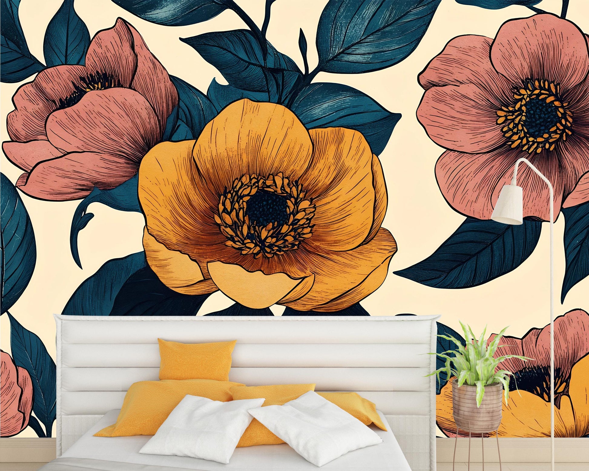 Transform your walls with this vintage-inspired floral wall mural, featuring golden yellow and blush pink flowers with rich teal leaves on a soft cream background. This mural creates a timeless botanical statement perfect for adding elegance, warmth, and artistic detail to any space.