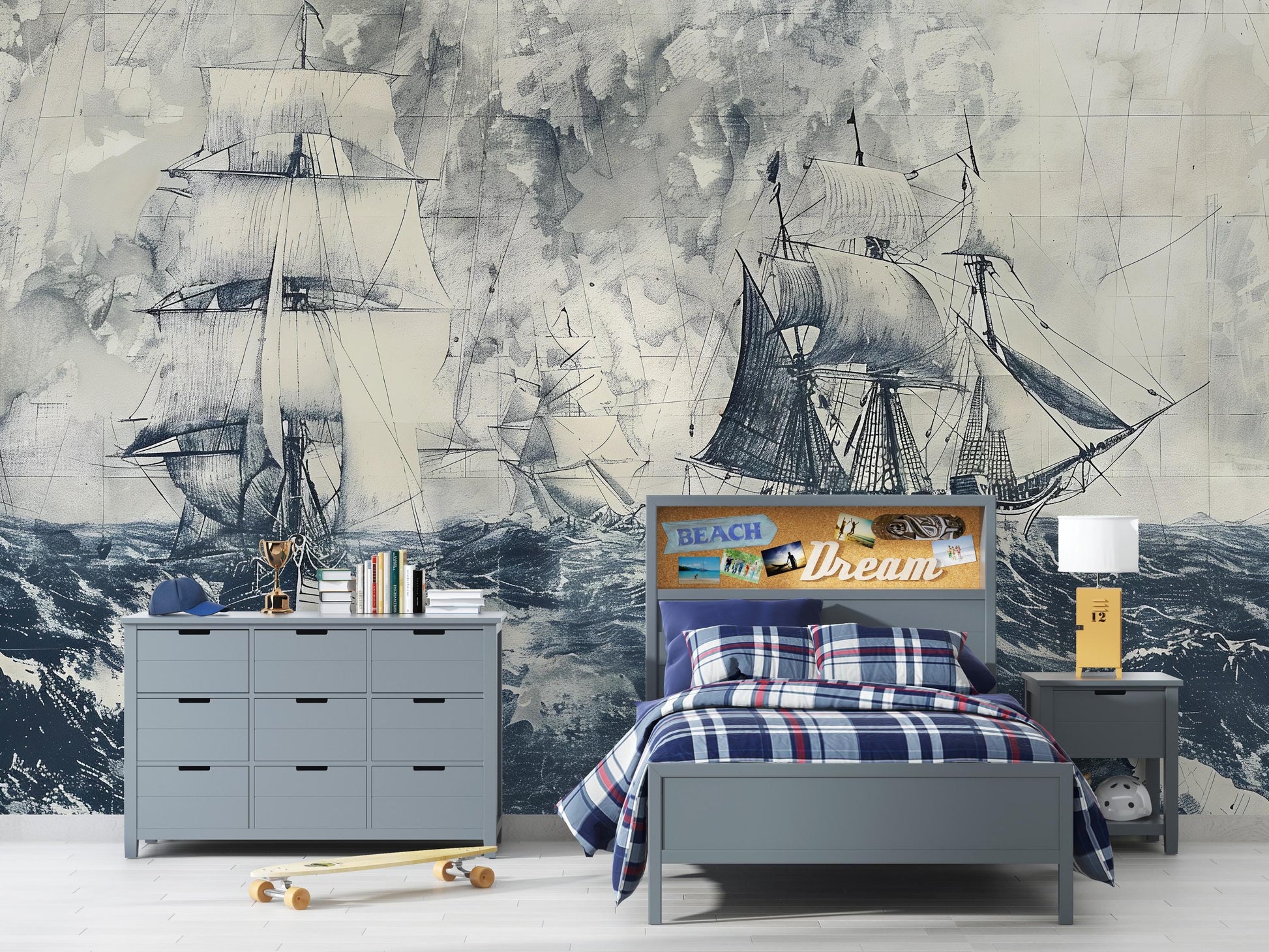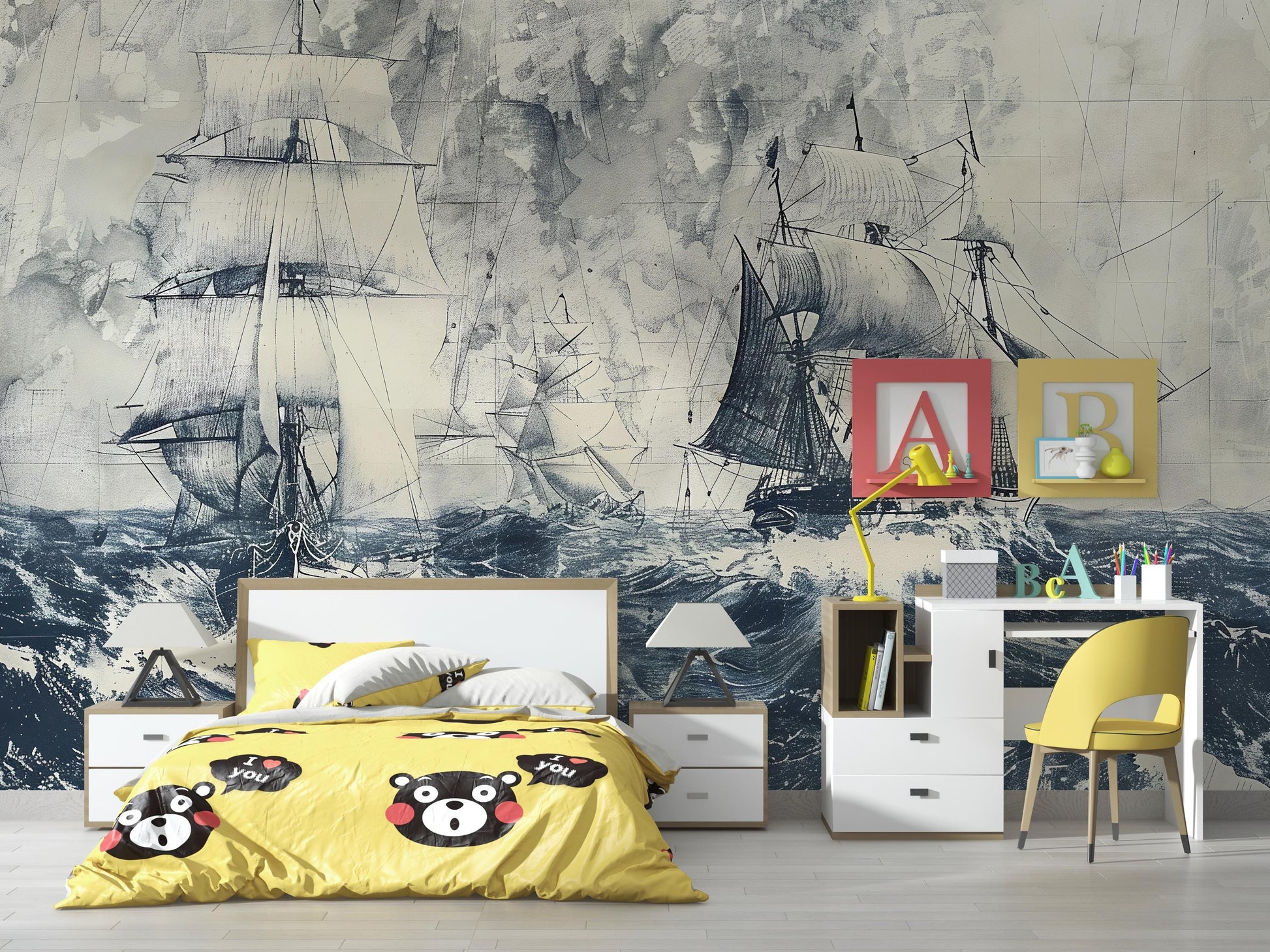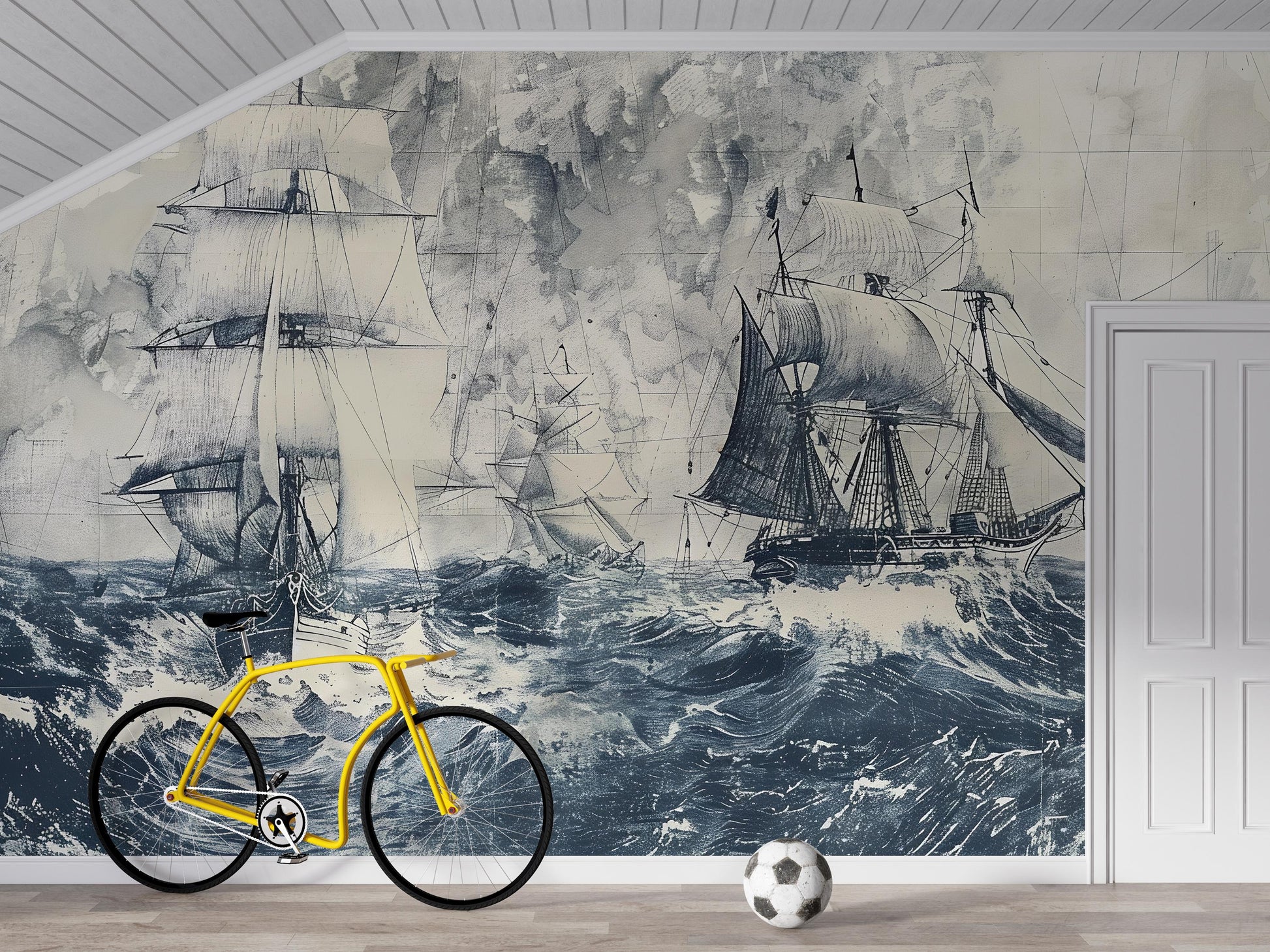 Bring the spirit of adventure into your home with this vintage nautical wall mural featuring detailed tall ships sailing across stormy seas. With a hand-drawn etching style and classic navy blue tones, this mural is perfect for nautical interiors, coastal living rooms, boys’ bedrooms, or maritime-inspired offices. The dramatic waves and timeless sailing ships create a bold, adventurous focal point that pairs well with rustic, coastal, or industrial decor. Easy to install and perfect for creating a unique statement wall.