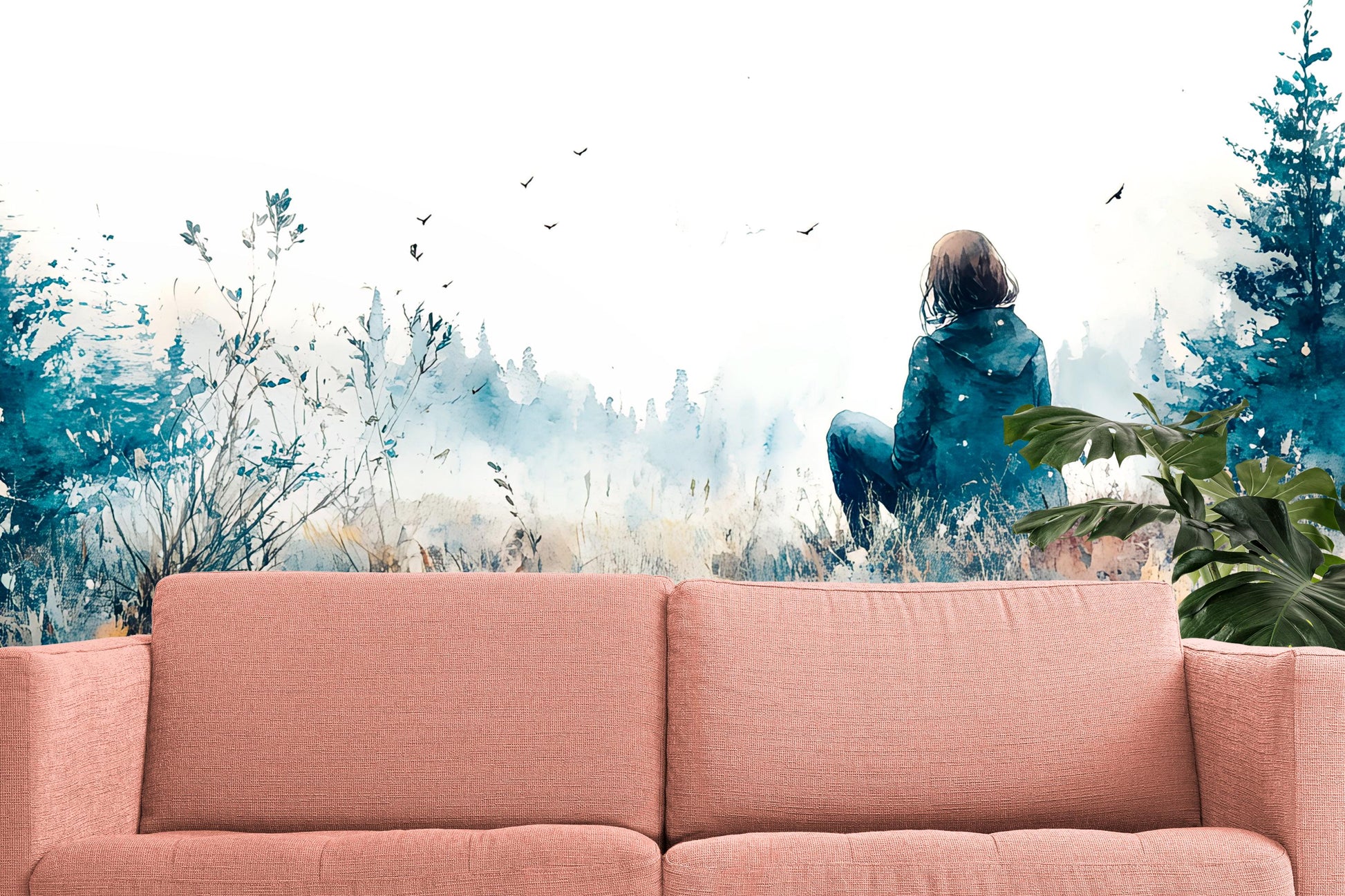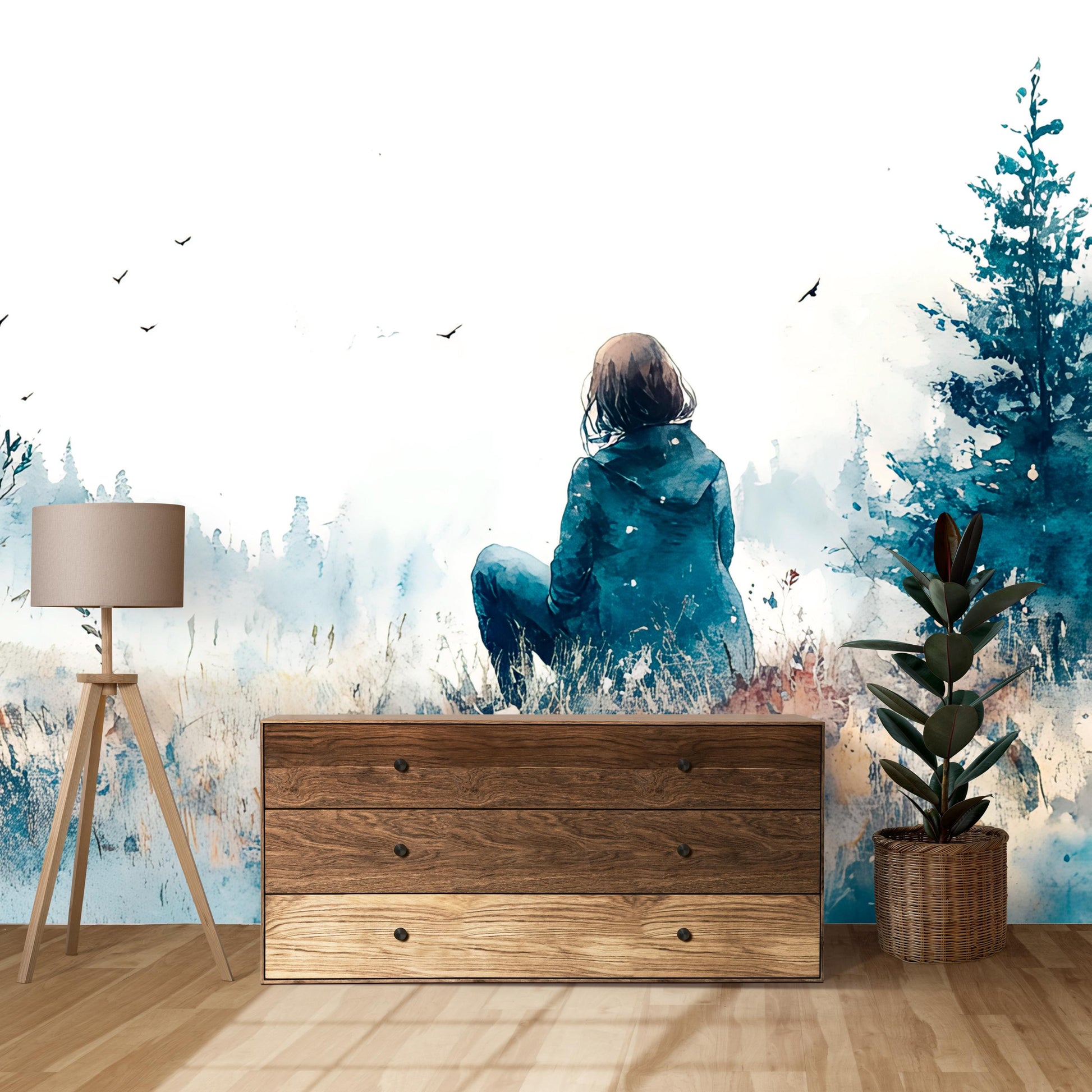 Transform your living space with this peaceful watercolor-style wall mural, featuring a contemplative figure sitting amidst a serene blue forest. The calming design blends nature and emotion, perfect for adding a soft artistic touch to your living room, bedroom, or meditation space. Easy to apply and ideal for statement walls or cozy corners.