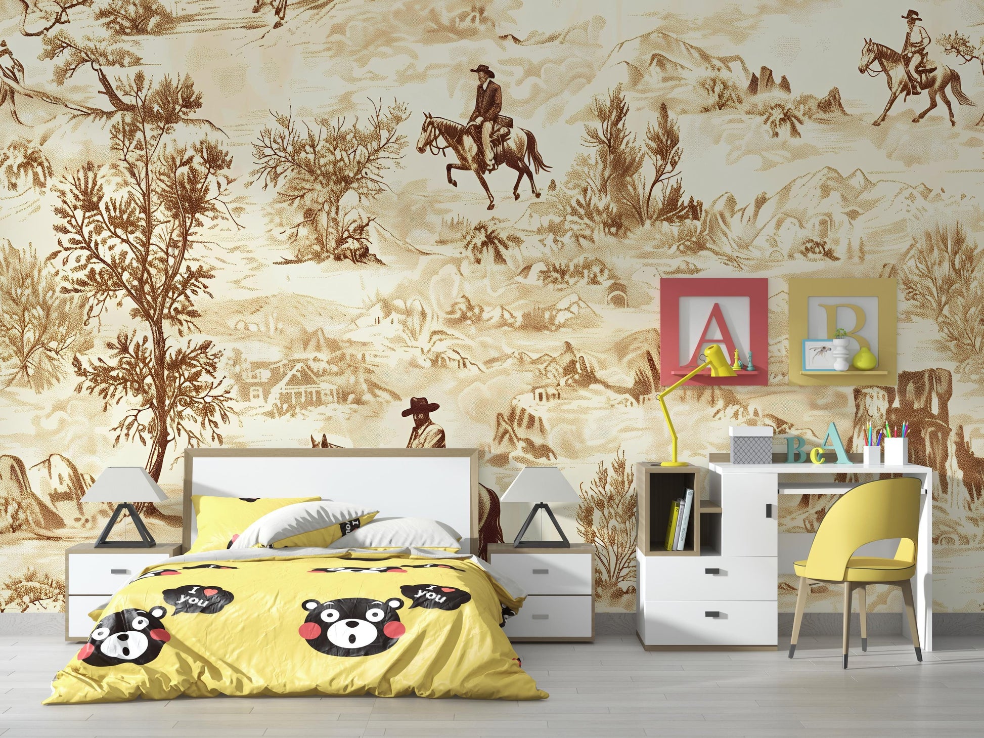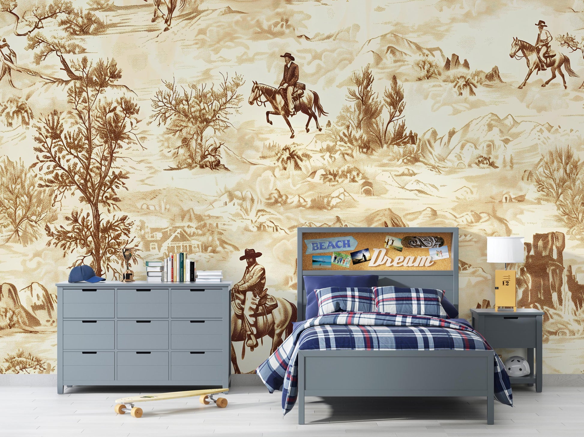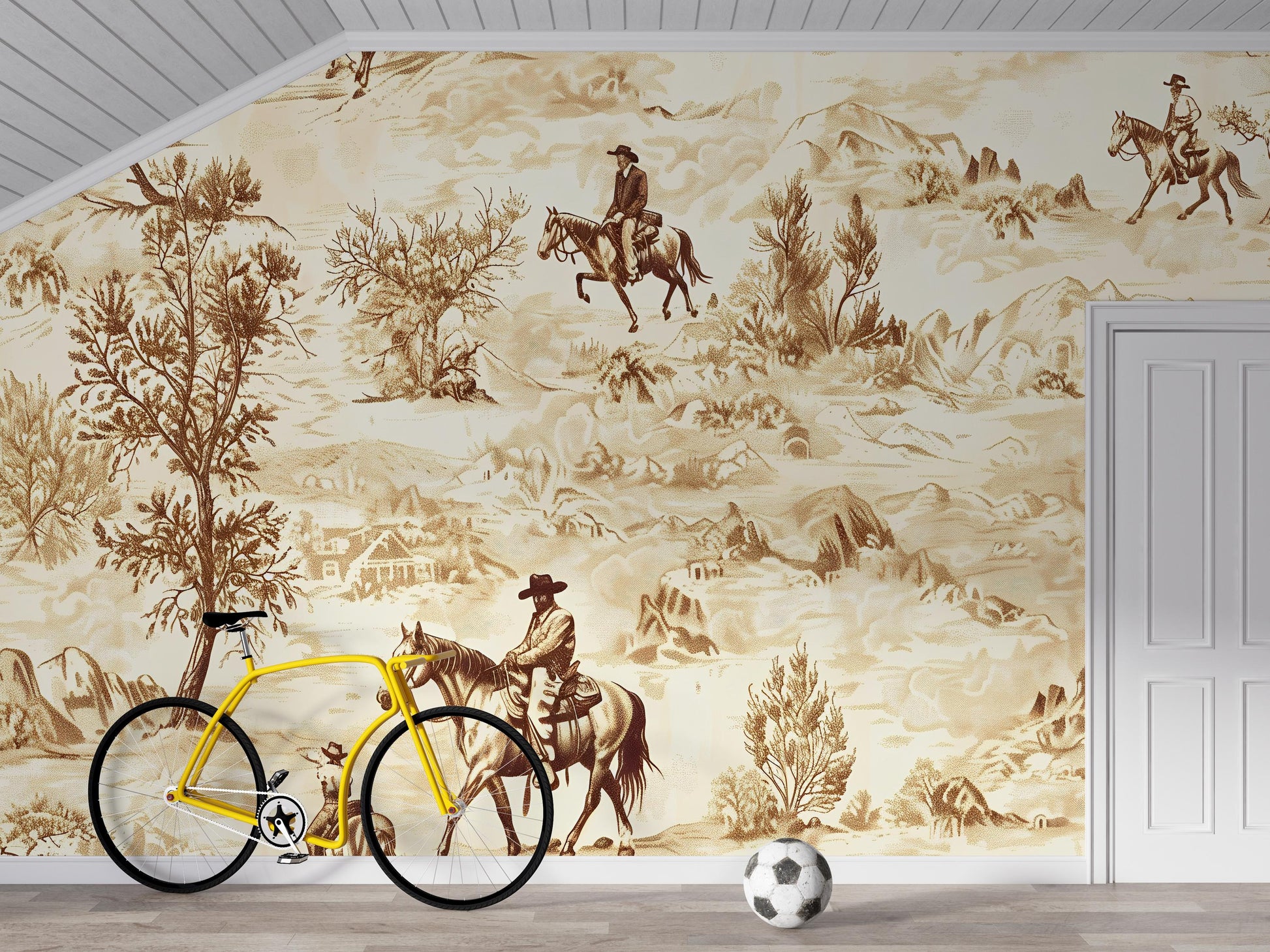 Bring the spirit of the Wild West into your space with this cowboy wall mural. Featuring sepia-toned illustrations of horse riders, rugged landscapes, and desert scenes, this mural adds a timeless rustic charm to any room.